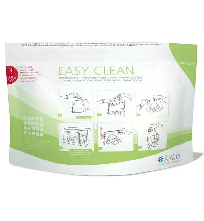 Специальные пакеты Easy Clean от Ardo — идеальное решения для паровой очистки любых аксессуаров, которые можно стерилизовать в микроволновой печи. С пакетами Easy Clean Вы максимально защитите ребенка от бактерий и другой патогенной микрофлоры. Без хлопот, кипячения или стерилизации! Это актуально в поездке, в роддоме, удобно дома, если надо быстро простерилизовать молокоотсос. Достаточно всего пары минут для полной стерилизации!