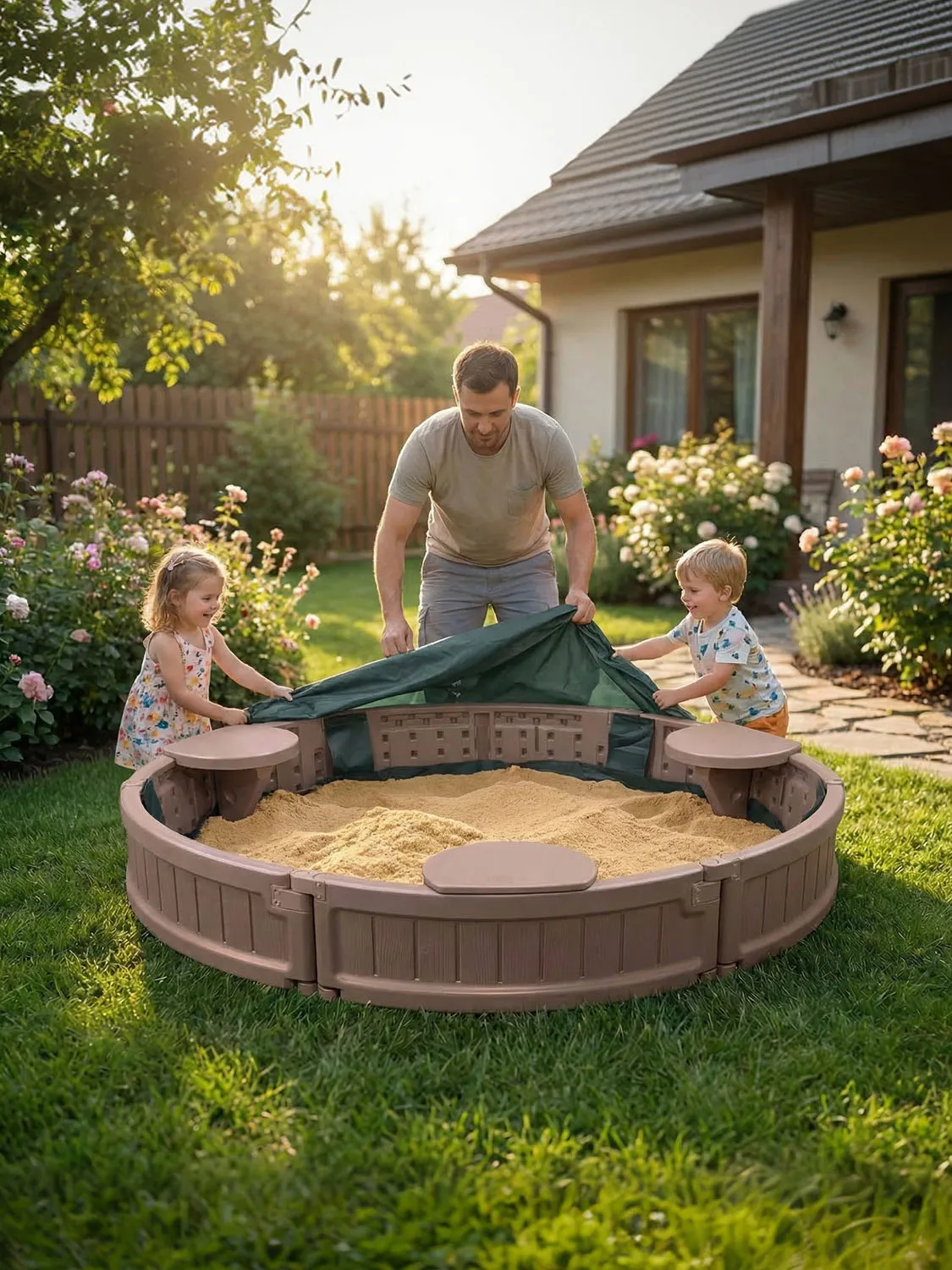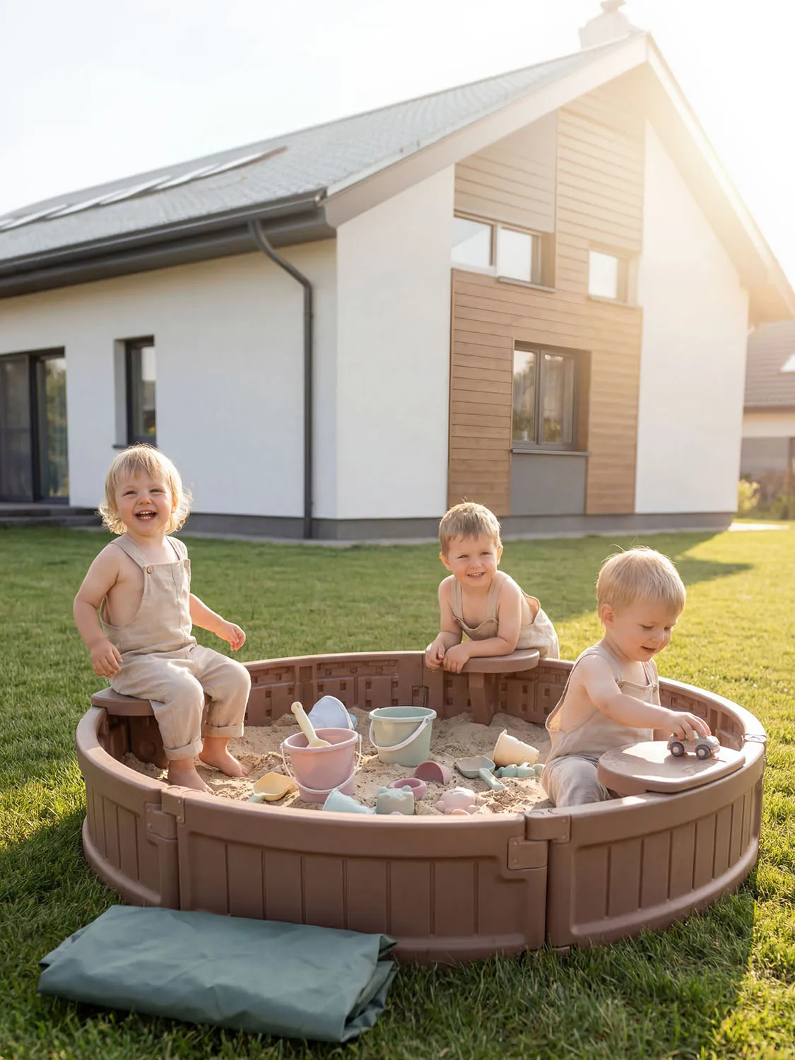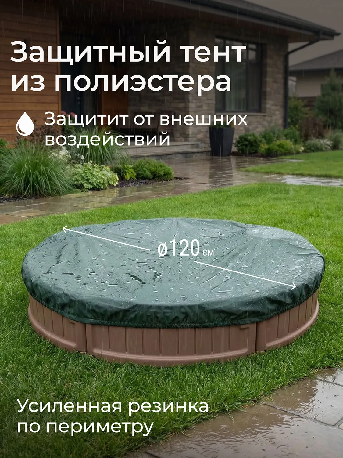 Особого внимания заслуживает защитный тент из прочного полиэстера с усиленной резинкой по периметру. Тент эффективно защищает внутреннее пространство песочницы от влаги, пыли и солнца.