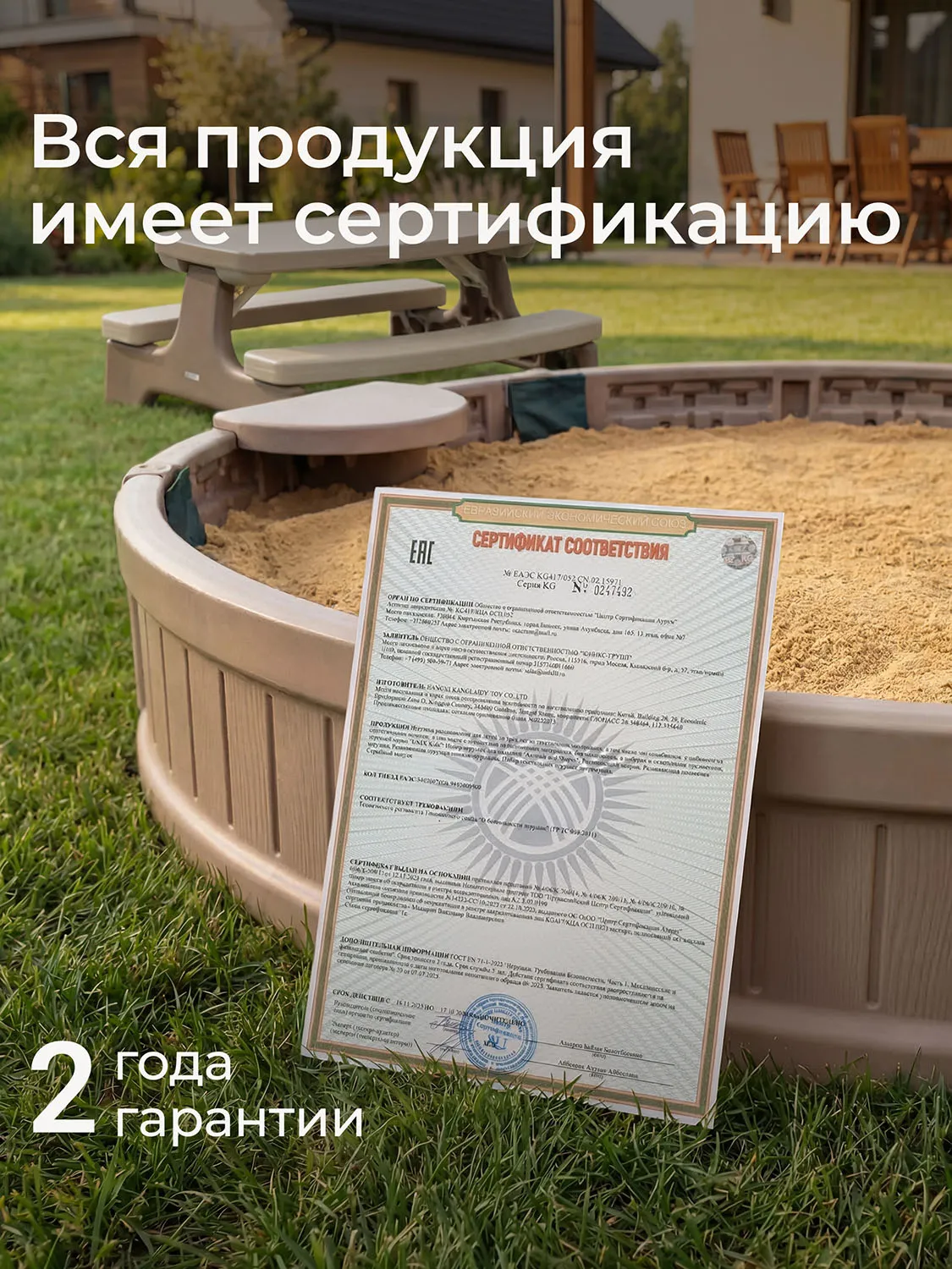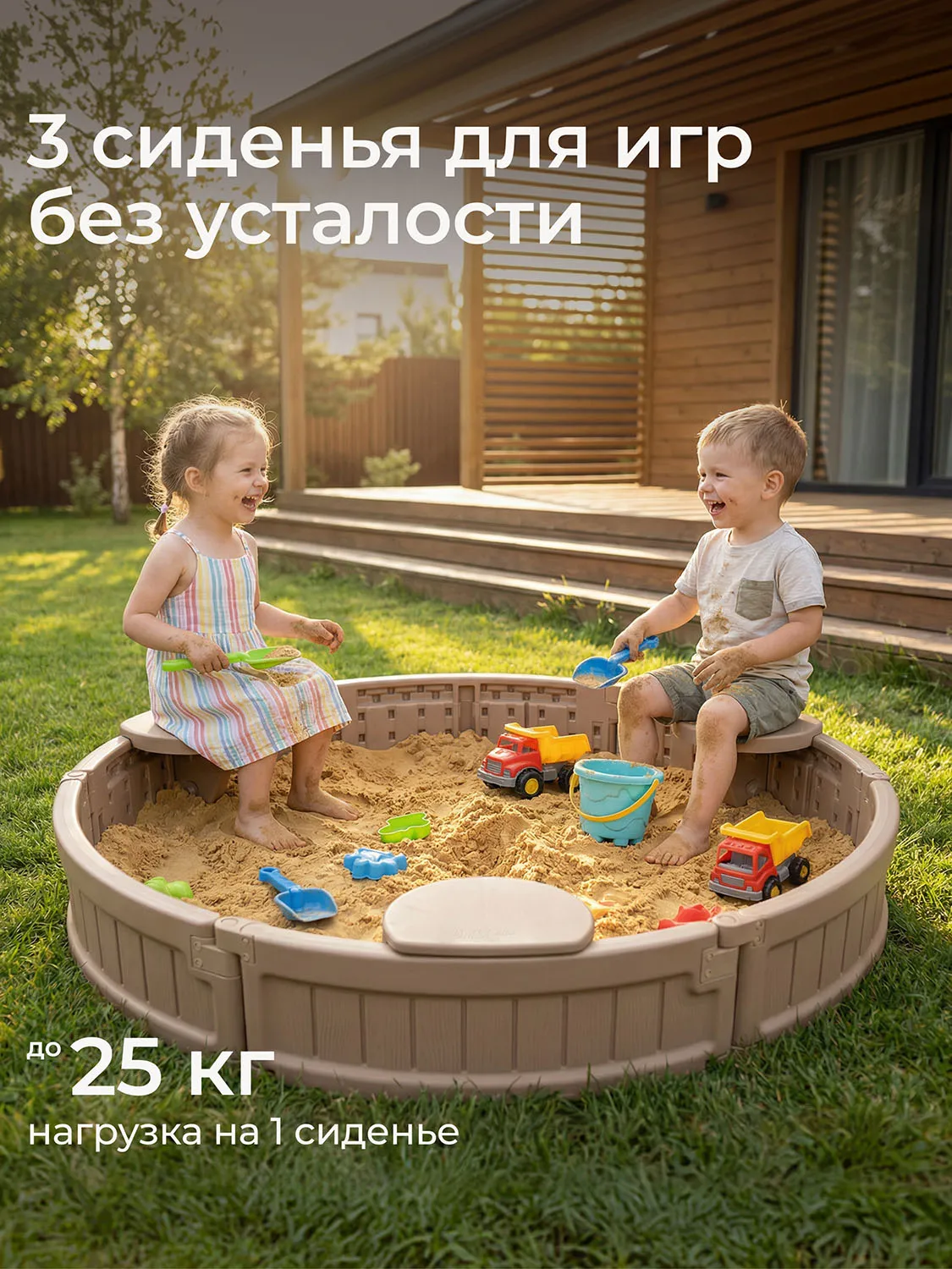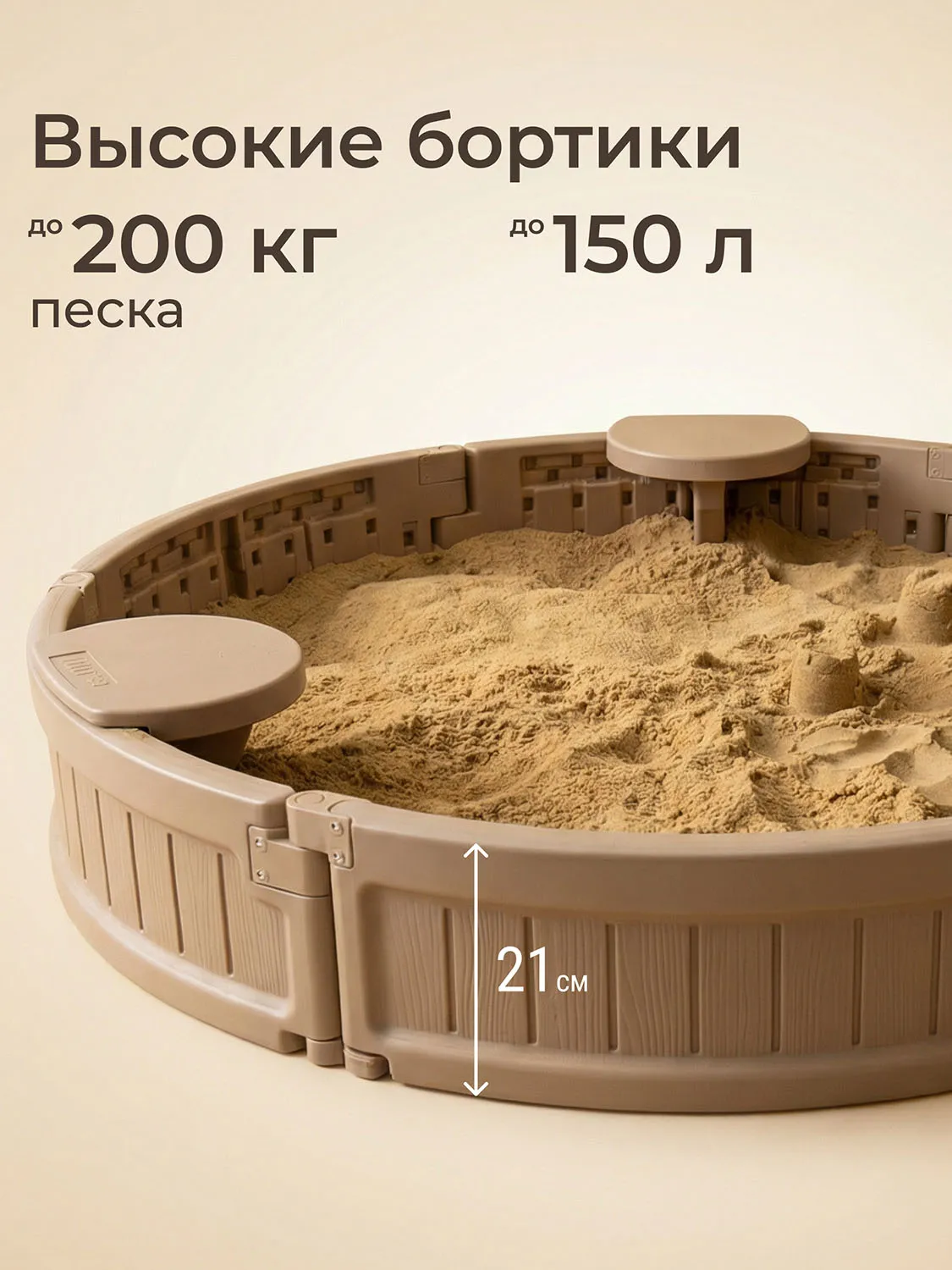 Каждое сиденье рассчитано на нагрузку до 25 кг. Максимальная вместительность составляет до 200 кг песка (около 150 литров), что позволяет создать обширную зону для творчества и развлечений.