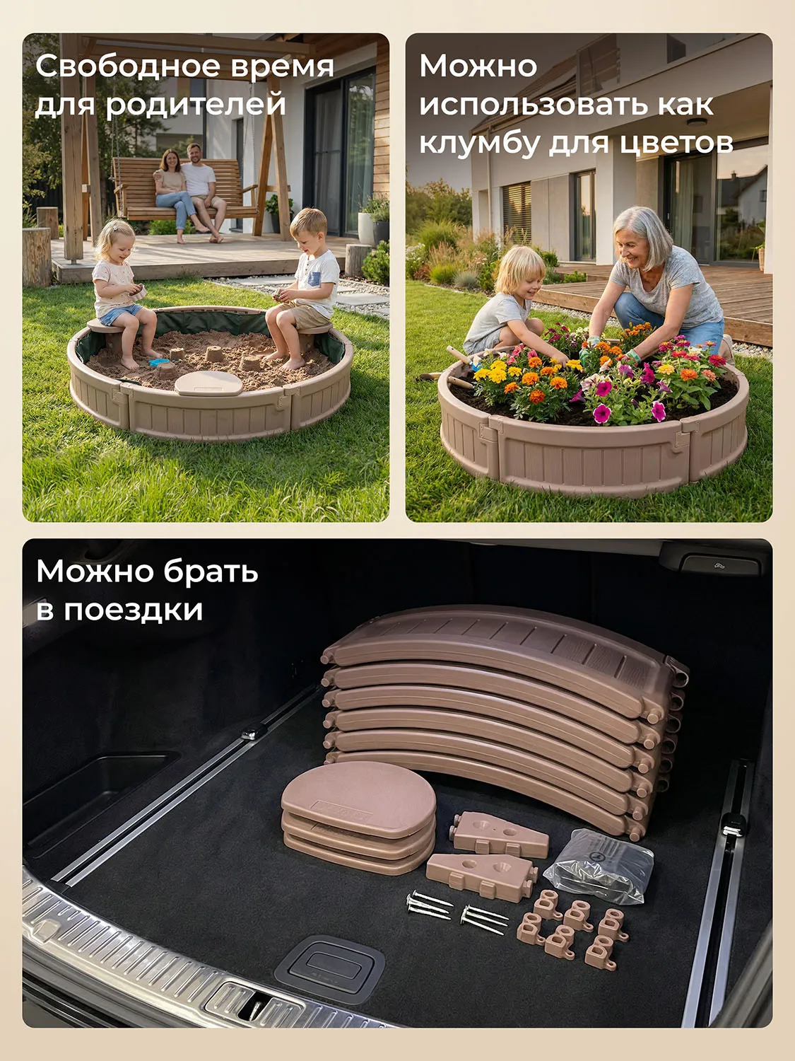 Универсальность использования позволяет устанавливать песочницу для малышей как на улице, так и в помещении, расширяя возможности организации досуга ребенка. Компактные габариты делают изделие удобным в поездках. Можно использовать как ограждение или заборчик для клумбы на даче.