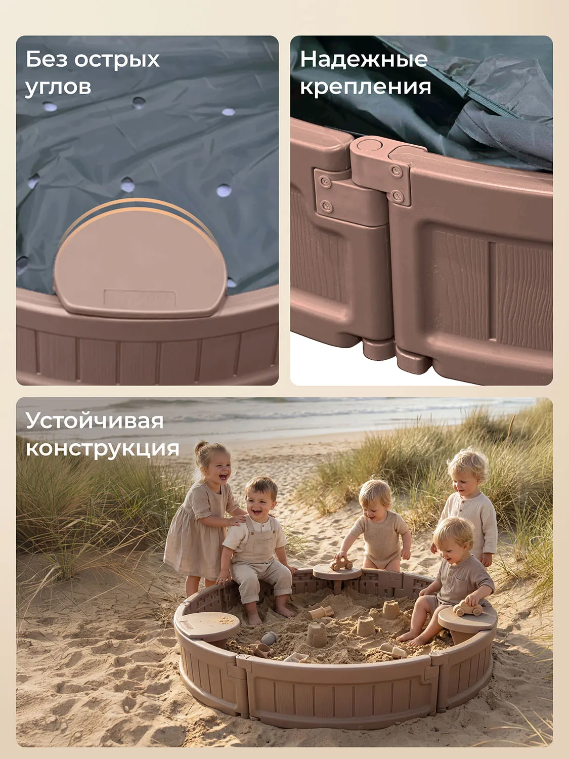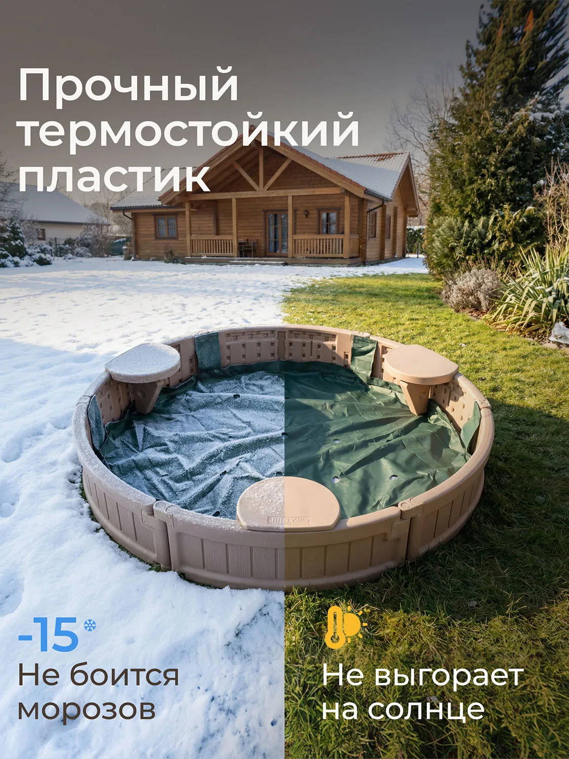 Уличная пластиковая песочница сохраняет свою прочность и функциональность при температуре до -15 градусов, благодаря чему подходит для эксплуатации в регионах с холодным климатом. Специально разработанная форма без острых углов обеспечивает дополнительную защиту от случайных травм.