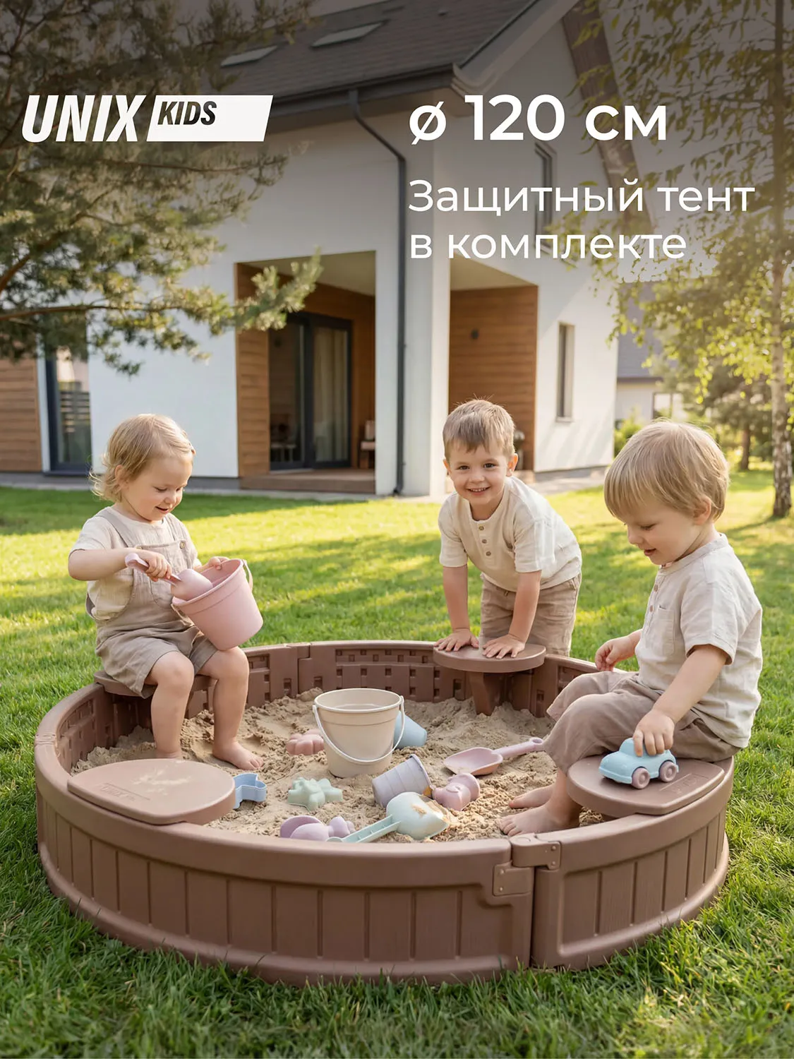 Детская круглая песочница с защитным чехлом UNIX Kids для улицы и дома – это увлекательное и функциональное игровое пространство, идеально подходящее для активного отдыха детей дошкольного возраста. Она выполнена в форме круга D120 см и оснащена 3-мя удобными сиденьями для комфортного размещения детей во время игры.