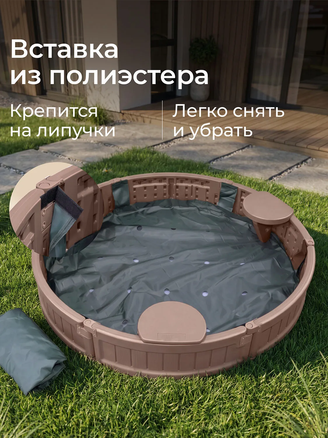 Конструкция оборудована специальным вкладышем из полиэстера, защищающим днище от попадания влаги и грязи. Вставка крепится на надежные липучки, легко снимается и быстро устанавливается обратно, позволяя родителям оперативно поддерживать чистоту игрового пространства.