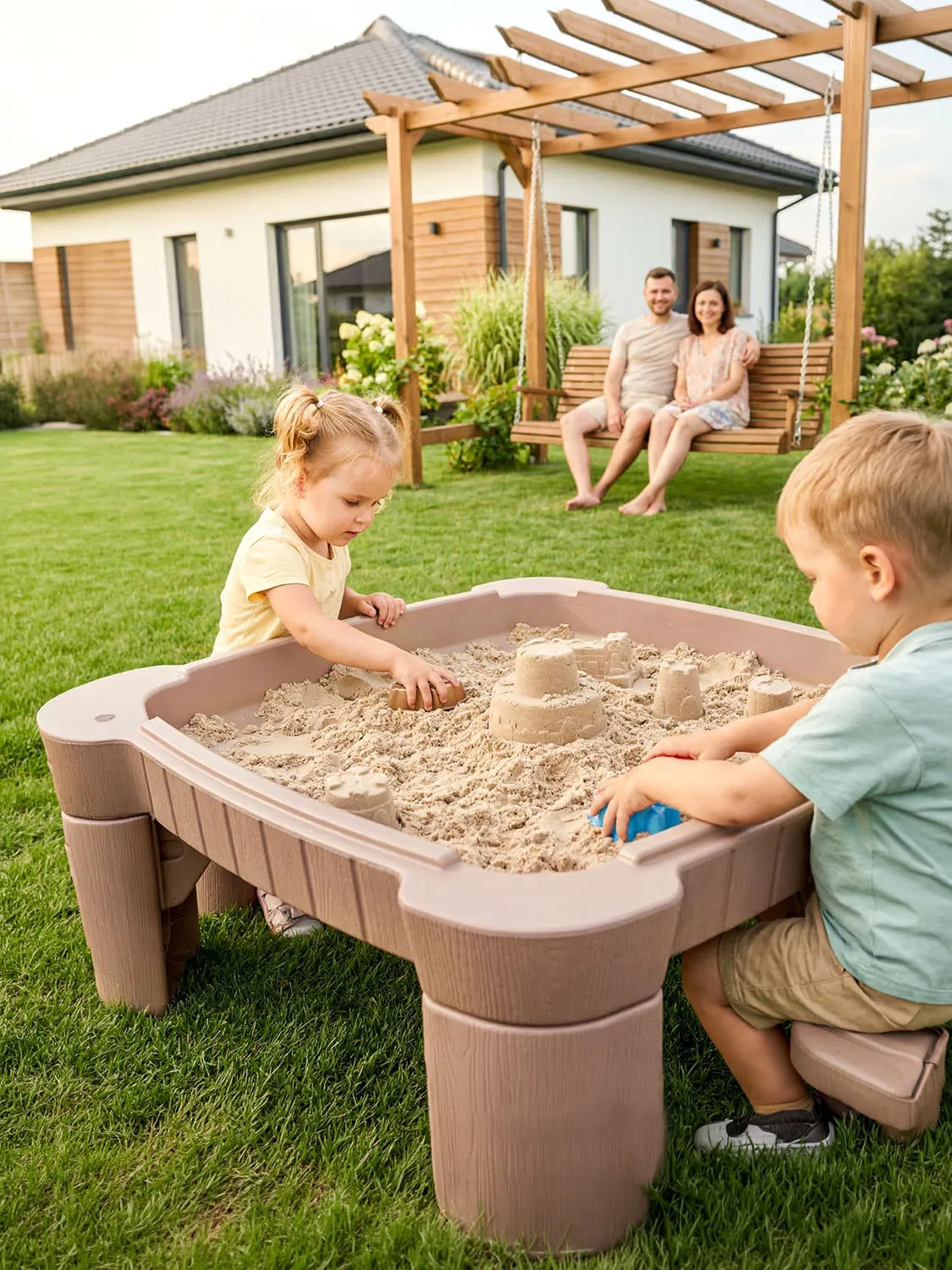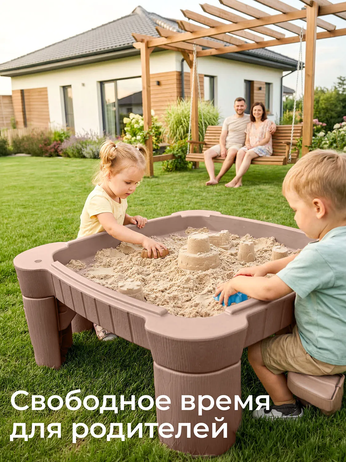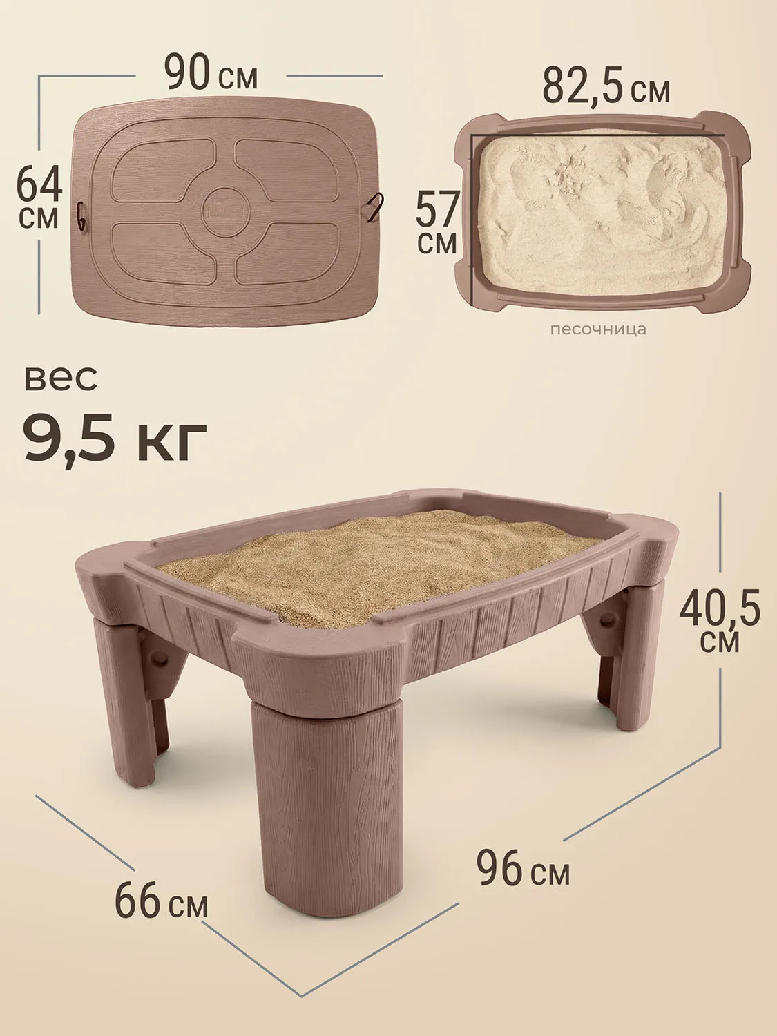 Высокие бортики 8 см предотвращают рассыпание песка или розлив воды наружу, позволяя ребенку играть без ограничений пространства. Благодаря удобной высоте ножек 30 см, дети смогут комфортно играть вокруг песочницы стоя или сидя. Размер поля для наполнения 82,5 × 57 см обеспечит достаточно места для веселых детских забав. Максимальная вместительность достигает 35 кг песка (около 24 литров).