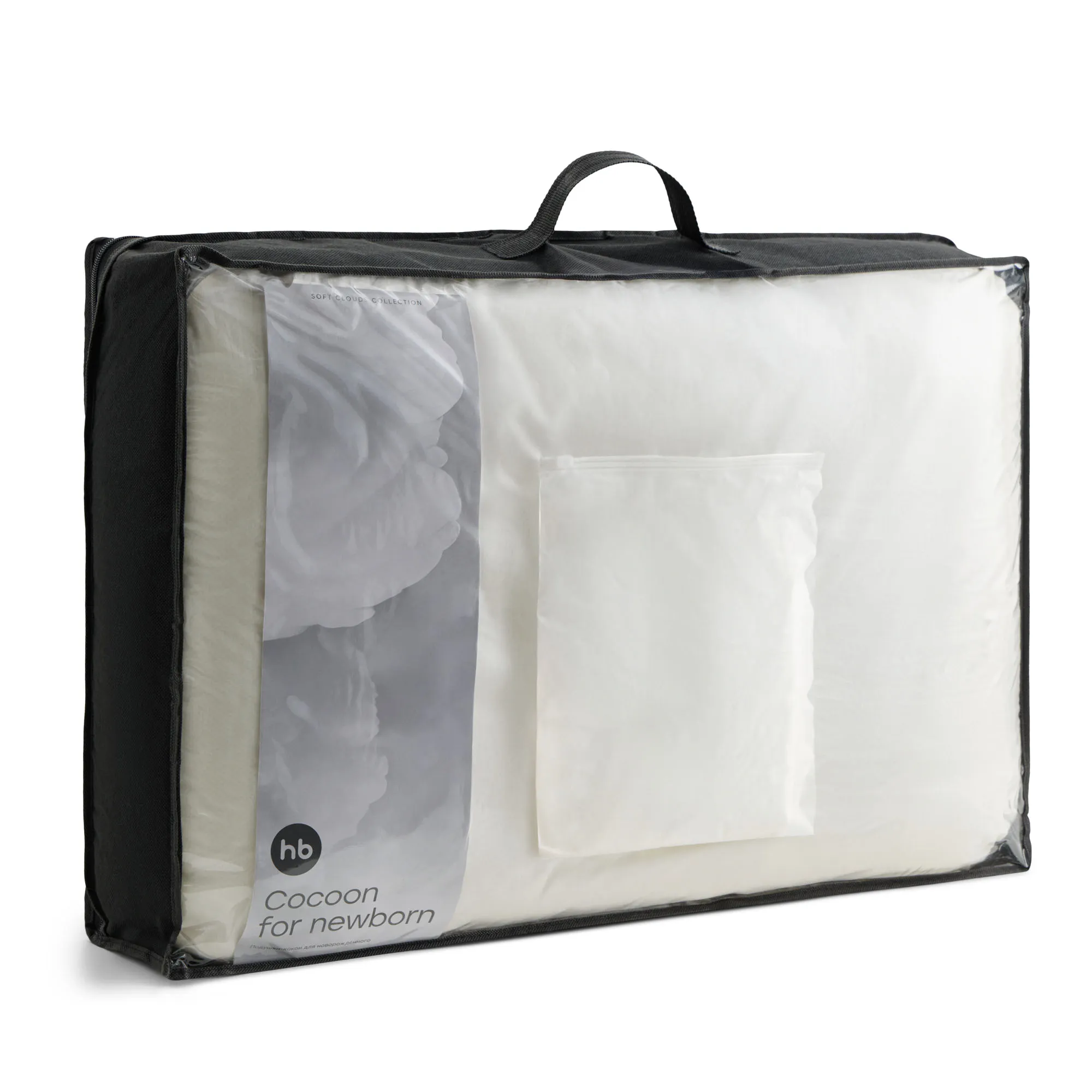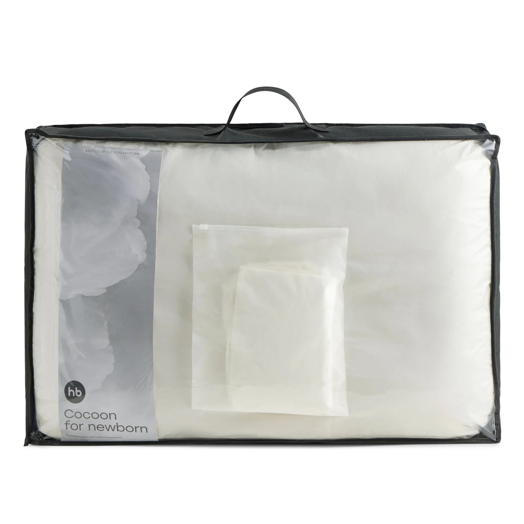 Верхний слой из вискозы и внутренним покрытием из полиуретана гарантирует мягкость и защиту от влаги, а боковые части из полиэстера придают чехлам прочность и форму. Кокон может использоваться не только как удобное гнездышко, но и как подушка-позиционер для новорожденных, обеспечивая правильное положение во время сна и предотвращая скатывание. Наполнитель из 100% полиэстера в составе кокона наполняет его легкостью и упругостью, создавая идеальную поддержку для маленького тела.
