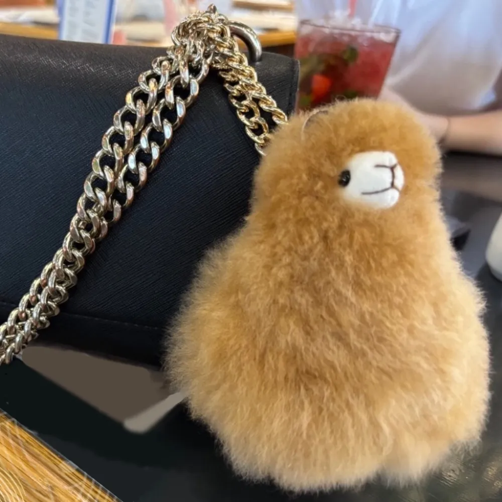 Подвеска-помпон мордочка альпаки: изысканный стиль и эксклюзивное качество. Подвеска выполнена из натурального меха альпаки, что придает ей мягкость и теплоту. Золотистая цепочка подчеркивает стиль и элегантность подвески, делая ее отличным аксессуаром для сумки или ключей.