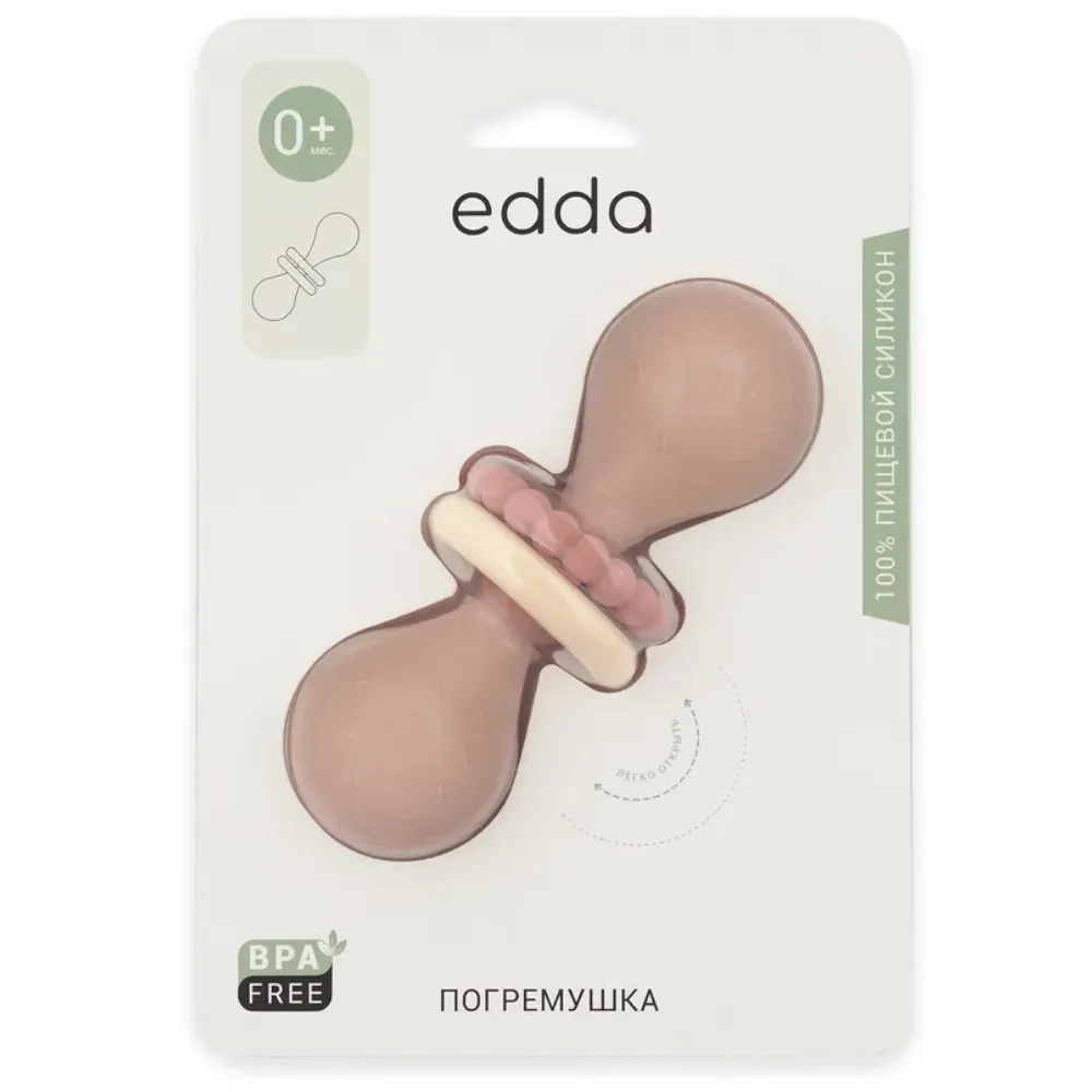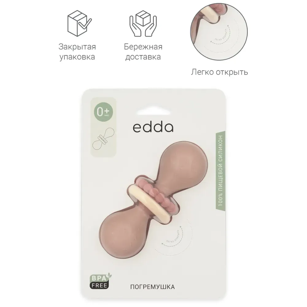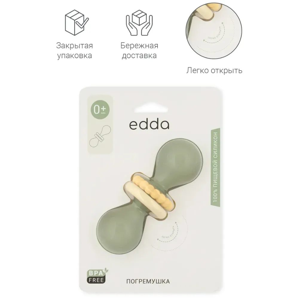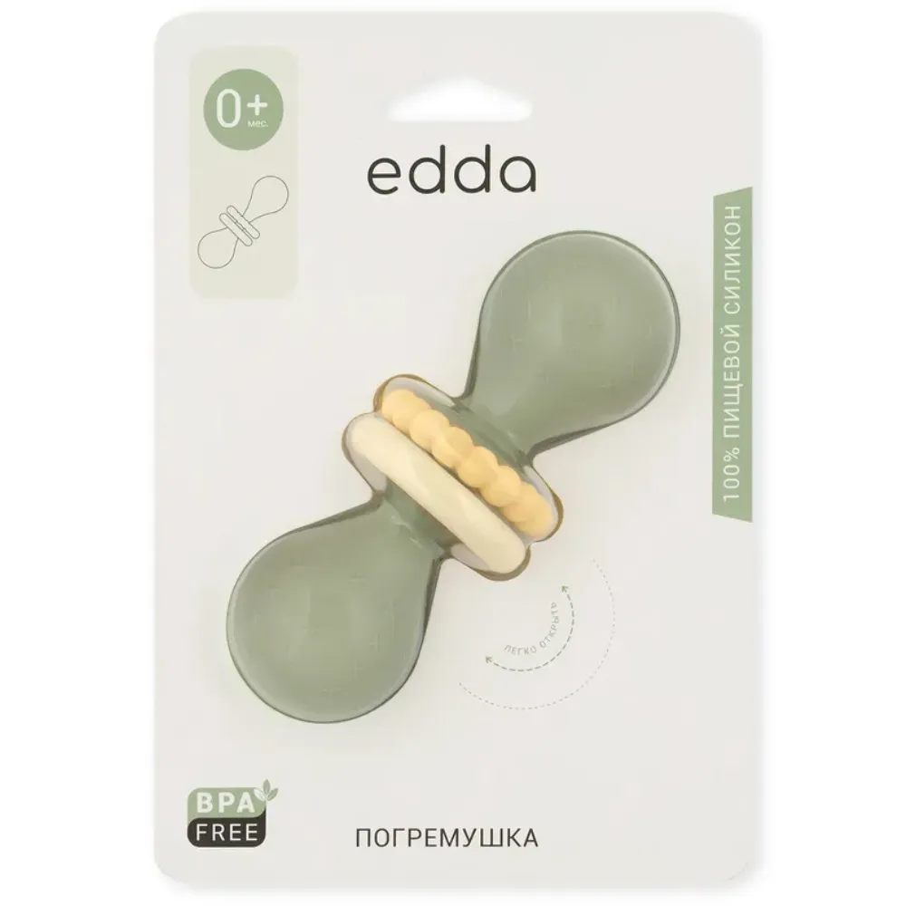 У лёгкой погремушки edda — эргономичная форма, которая идеально подходит для детских ладошек. Рельефная поверхность массирует дёсны при кусании, но не повреждает их, выполняя функцию прорезывателя. Игрушка тренирует сенсорное восприятие. На корпусе есть два дополнительных подвижных колечка для развития моторики. Погремушка из гипоаллергенного силикона издаёт успокаивающий звук и развивает ребенка через игру. Спокойные цвета игрушки гармонично впишутся в домашний интерьер.