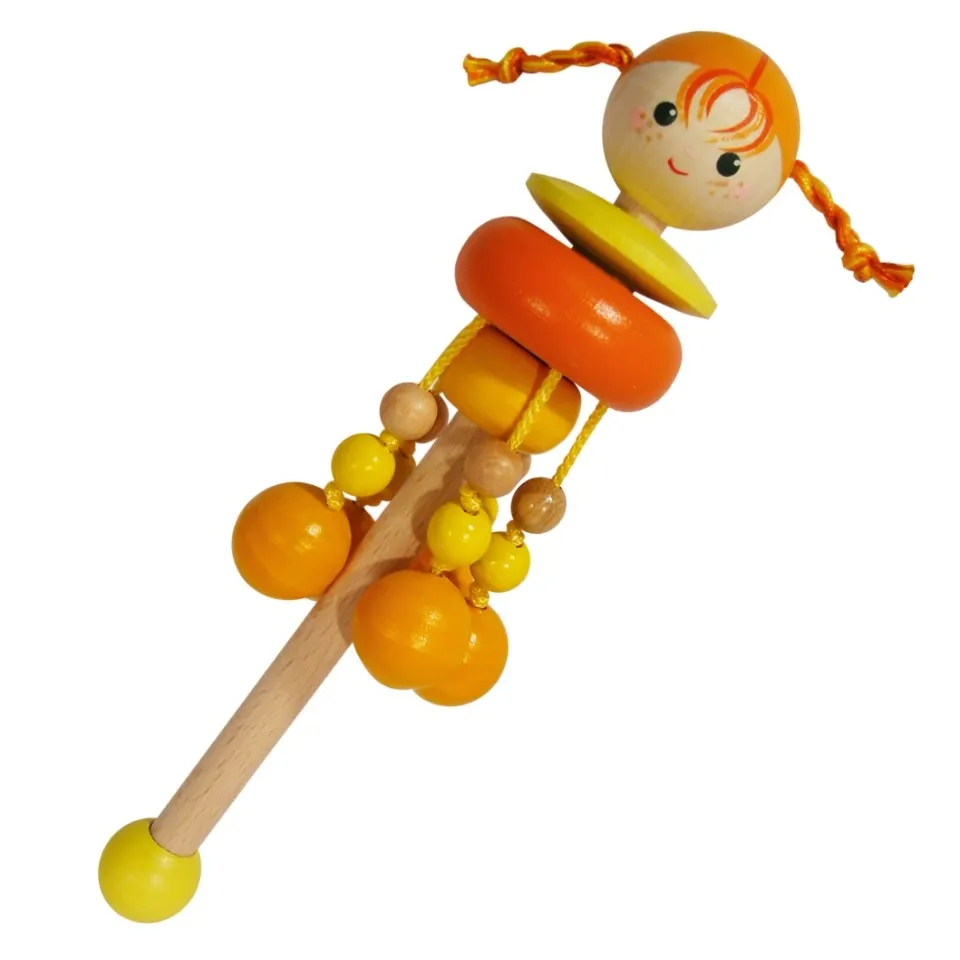 Девочка с улыбающимся лицом и хвостиками непременно вызовет интерес у вашего малыша. Игрушка приятно пахнет натуральным деревом, она способствует развитию обоняния. Также игрушка поможет малышу развить моторику рук, координацию движения и мышление. Покажите ребенку, как на шнурочках качаются бусинки, а затем полностью перестают двигаться. Ребенок научится удерживать внимание сначала на неподвижных бусинках, а затем на движущихся, координируя свои действия.