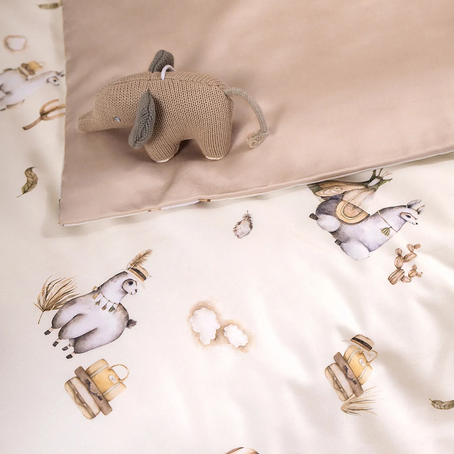 Комплект Alpaca разработан для кроватки со спальным местом 160х80 см. Дизайнерский принт украсит комнату, при этом не помешает малышу заснуть — цвета в узоре спокойные, натуральных оттенков. А милых акварельных персонажей будет интересно рассматривать после пробуждения. Кстати, пододеяльник двусторонний и выгодно сочетается и с наволочкой, и с однотонной простыней.