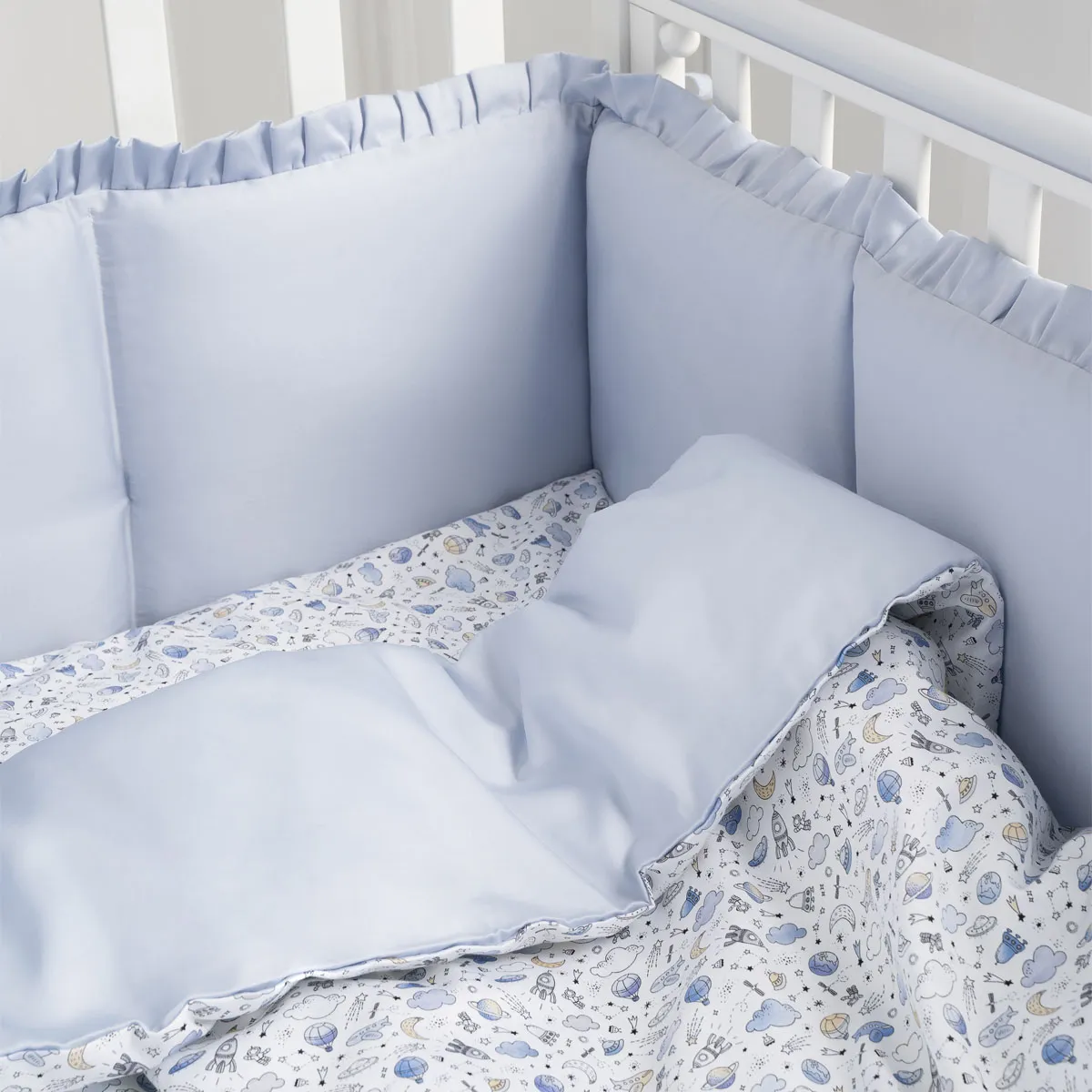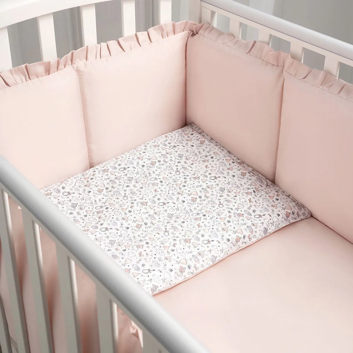 В пододеяльнике вместо традиционной прорези предусмотрена застежка-молния, которая аккуратно спрятана в нижней части. Обычный клапан после нескольких стирок растягивается, приобретает неряшливый вид, а застежка-молния помогает сохранить форму пододеяльника значительно дольше. Простыню на резинке легко заправлять, легко снимать. Она никогда не будет съеживаться во сне, даже если ребенок много ворочается, тем самым обеспечивая малышу больший комфорт, чем при использовании обычных простыней. Для дополнительного удобства бортики в кроватку сделаны из отдельных частей со съемным чехлом. Теперь вы легко можете стирать только внешнюю часть бортиков, не затрагивая внутреннее наполнение. Наполнитель Hollcon — экологически чистый, гипоаллергенный и легкий материал. Прекрасно сохраняет форму и надежно защищает малыша.