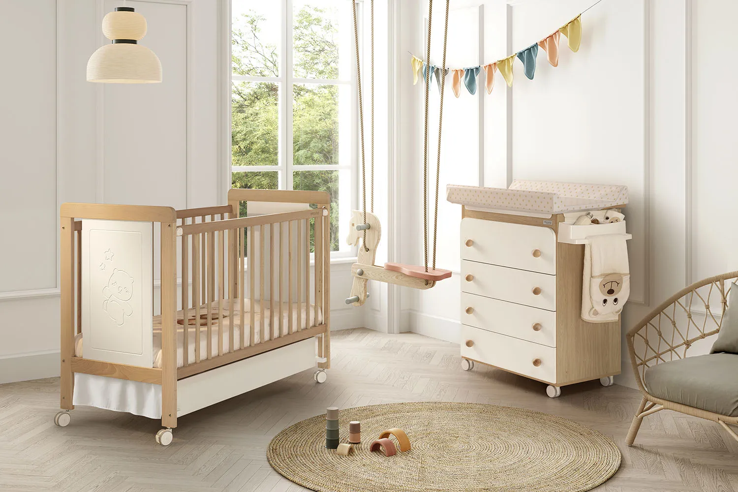 Подберите белье в тон от бренды Micuna — это наборы, которые состоят из защитных бортиков и покрывала. Также понадобится простынь 120х60 см.4. Пеленальная доска
