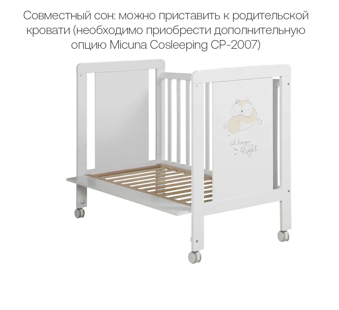 - Совместный сон: можно приставить к родительской кровати (необходимо приобрести дополнительную опцию Micuna Cosleeping CP-2007)