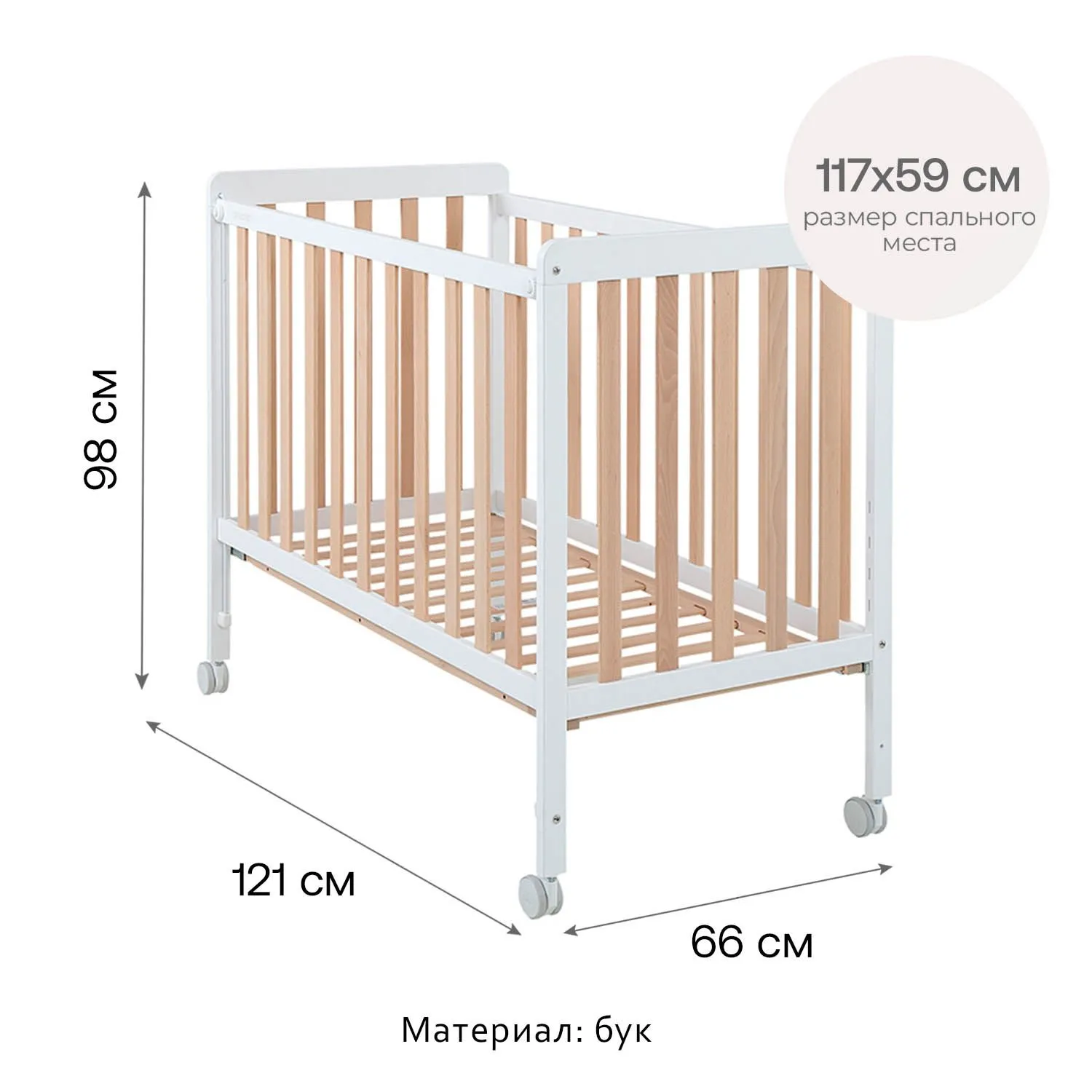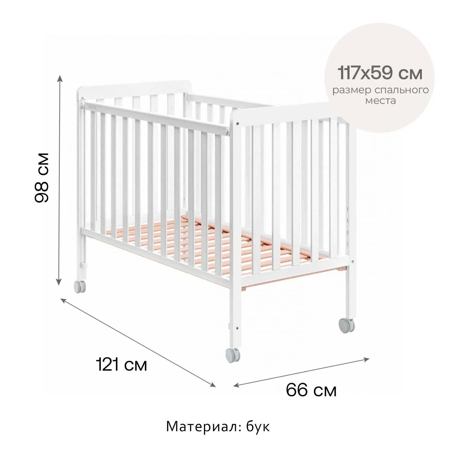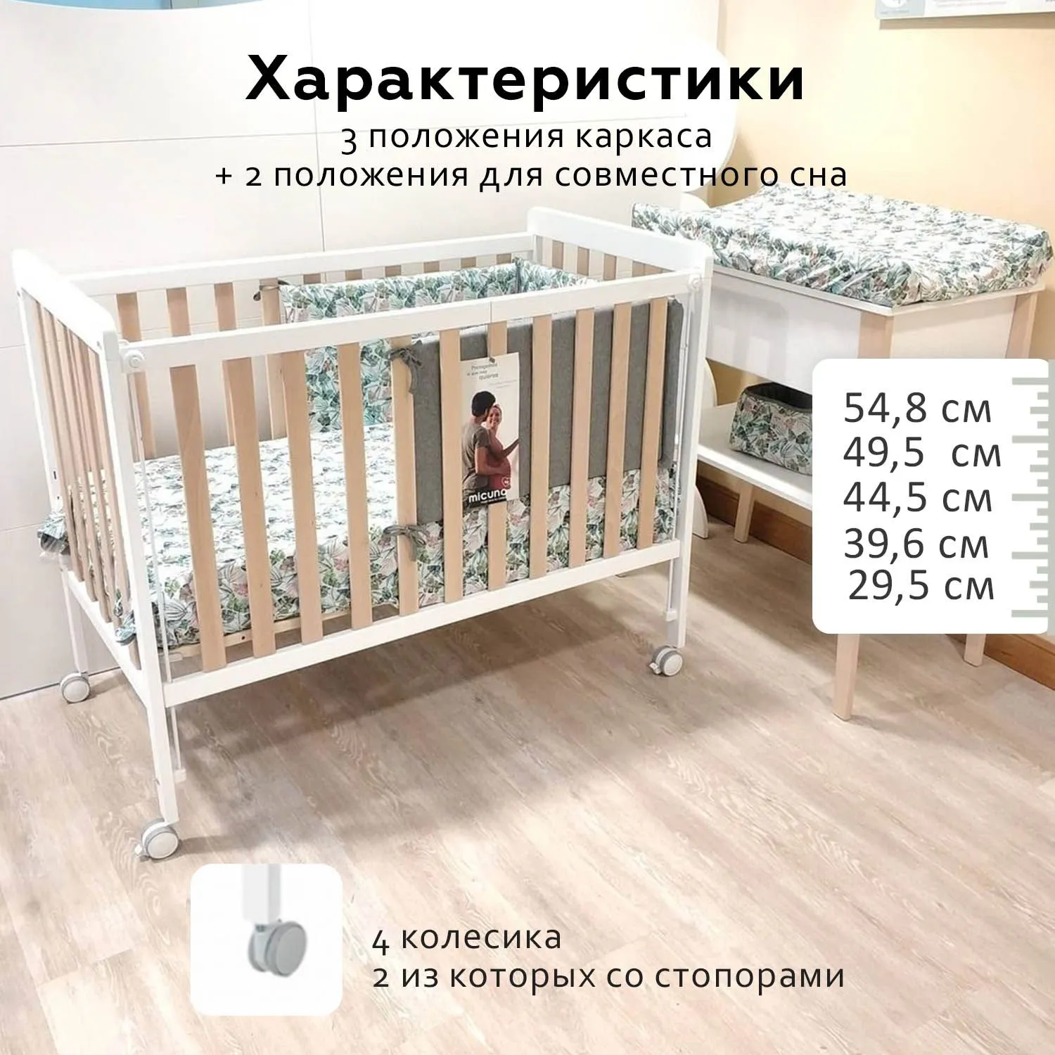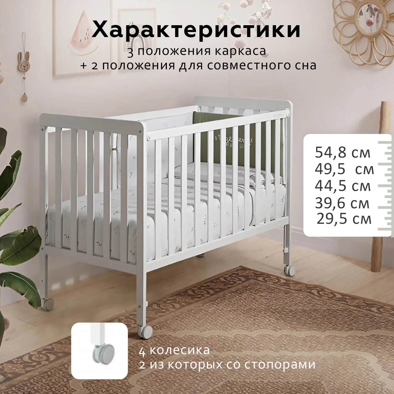 - Высота уровней ложа для кроватки на колёсах: 29.5/ 39.6/ 44.5/ 49.5 /54.8 см