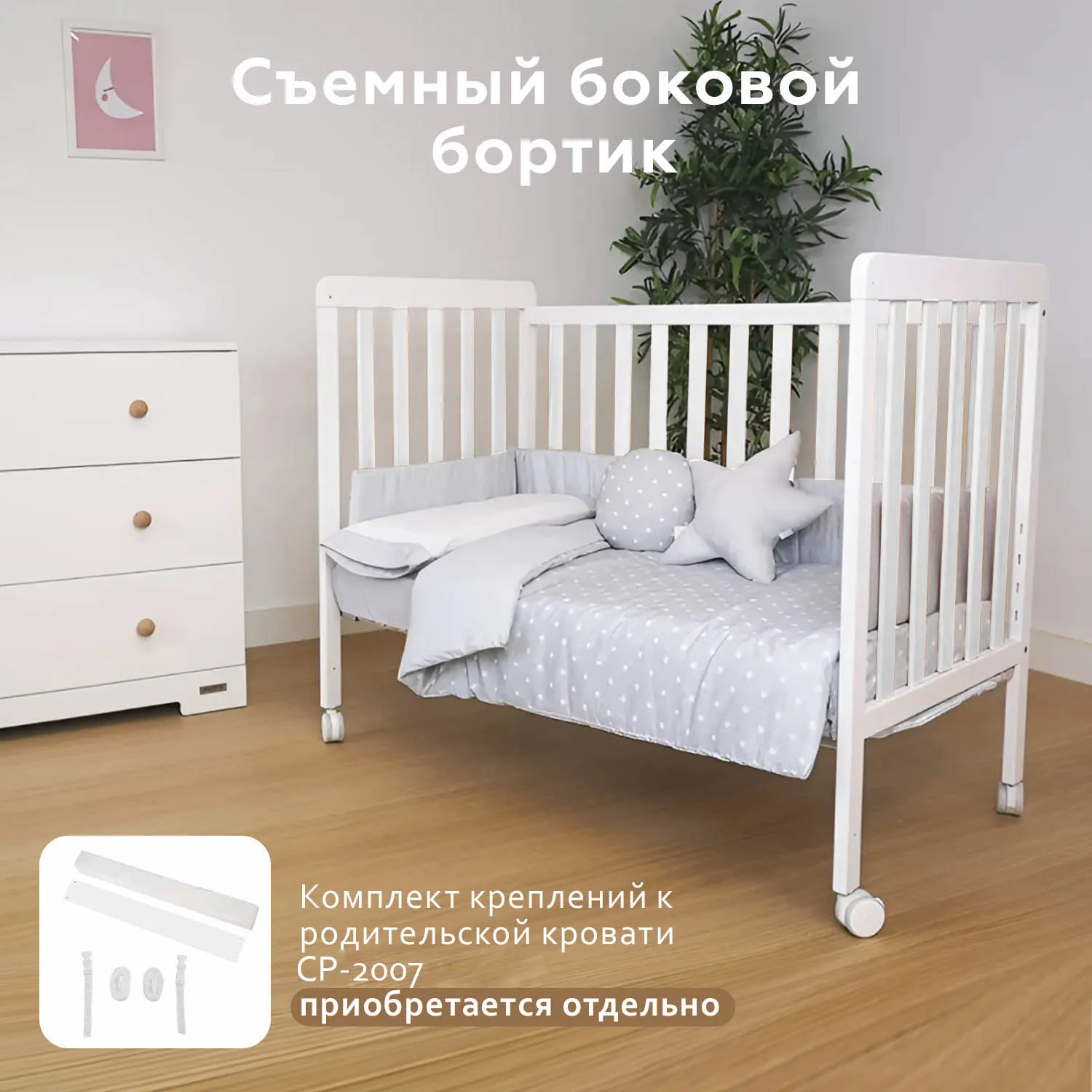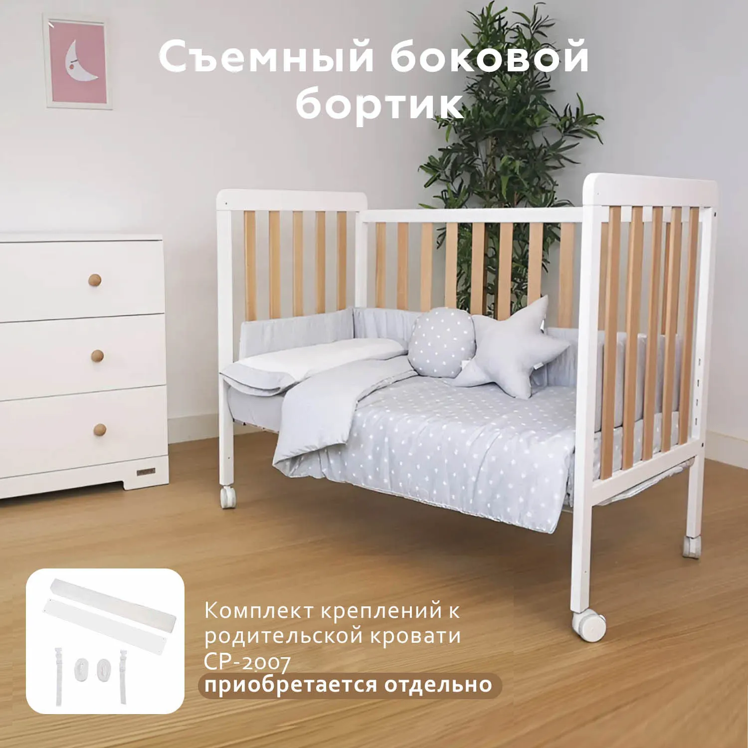 Если вы планируете совместный сон, необходимо приобрести опцию CP-2007. Она представляет собой комплект креплений и планки, с помощью которых можно превратить кроватку в приставную, чтобы малыш спал рядом с родителями.