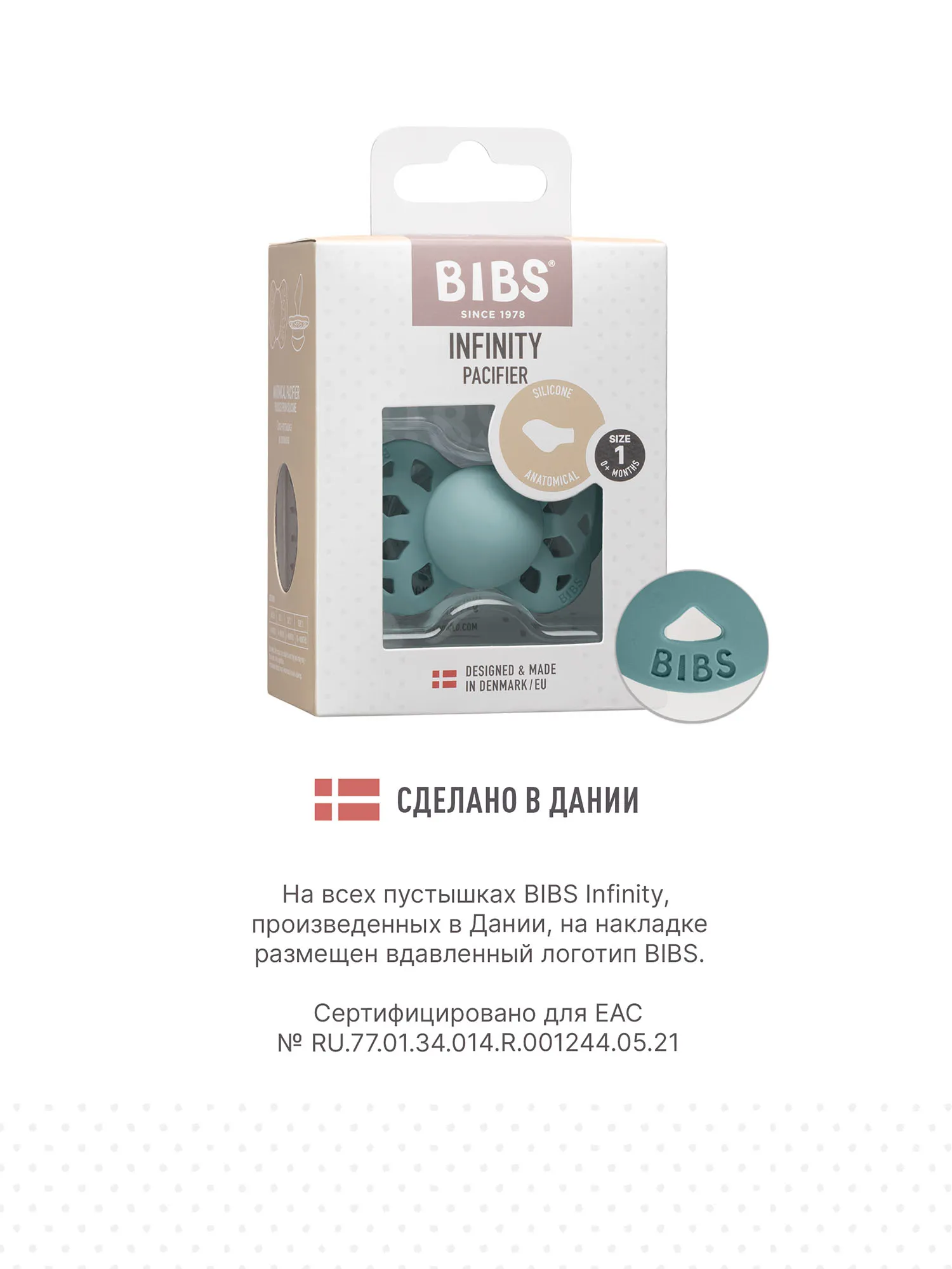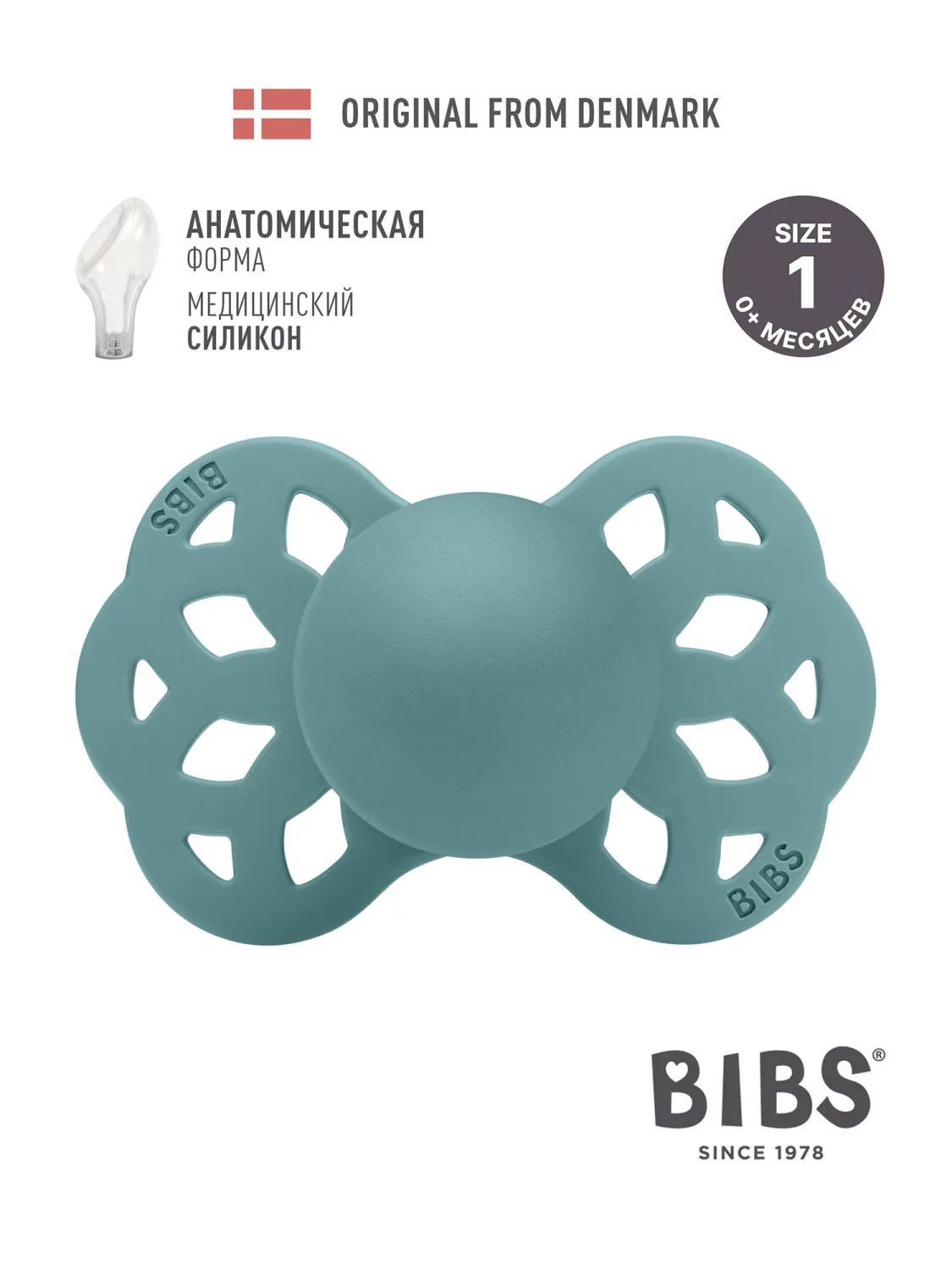 Пустышки BIBS изготавливаются из экологичных, на 100% безопасных материалов. Сосок выполнен из гипоаллергенного силикона без запаха и вкуса, а накладка (шилдик) — из полипропилена. Силиконовая пустышка обладает высокой прочностью и хорошо массирует дёсны во время прорезывания зубов.