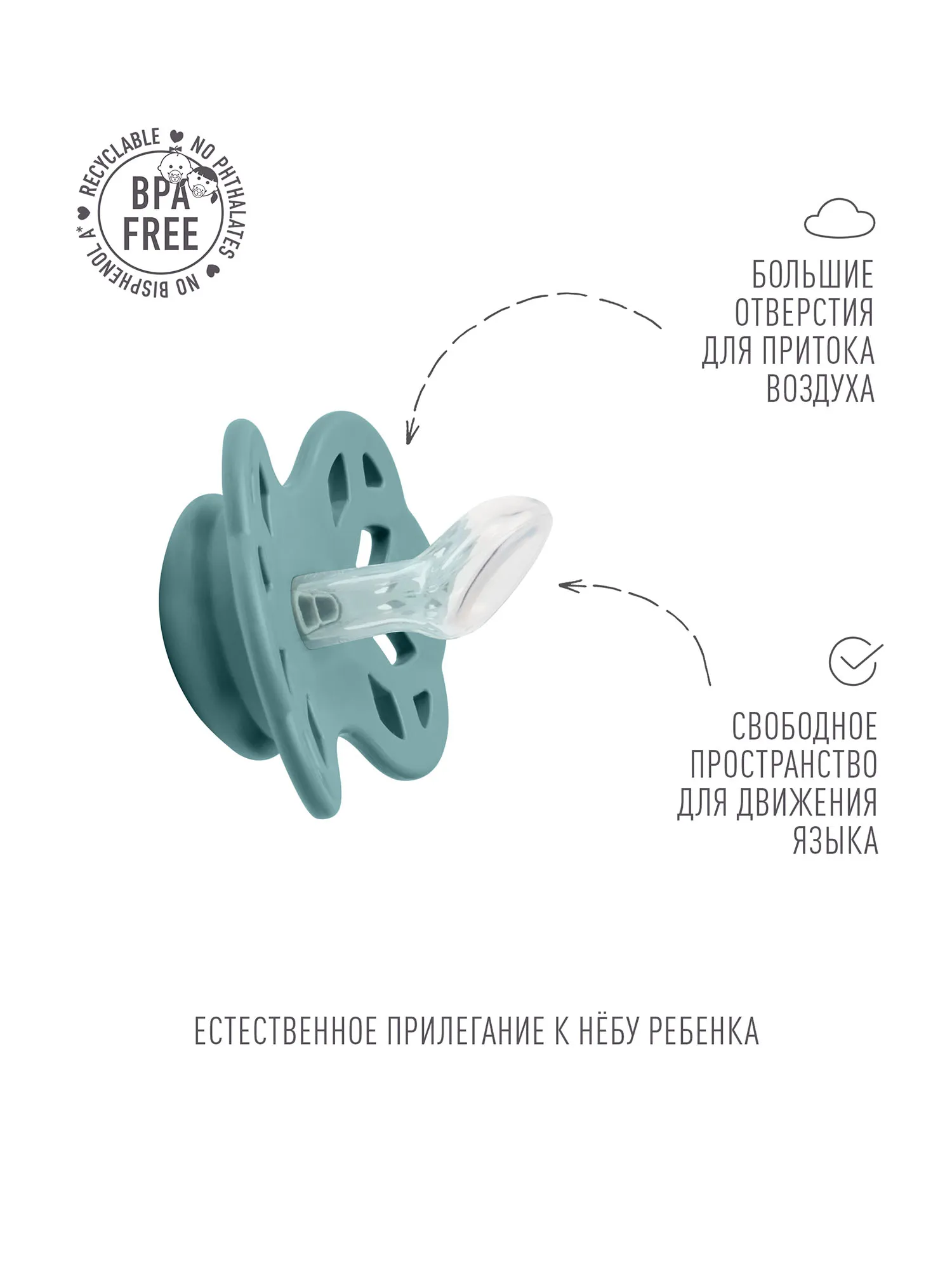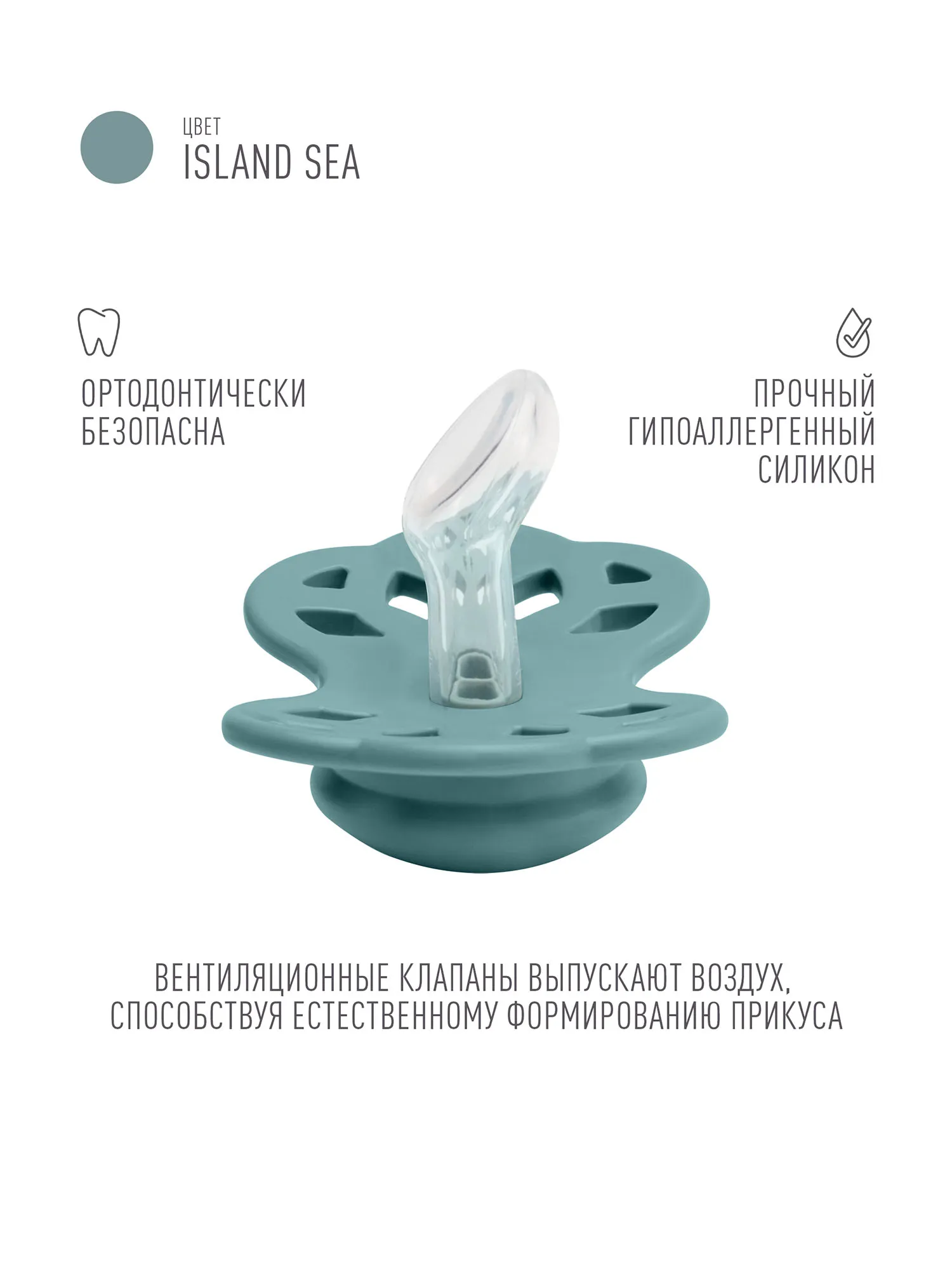 Дизайн накладки продуман таким образом, чтобы минимизировать контакт с чувствительной и нежной кожей вокруг рта ребенка. В каждой пустышке BIBS есть специальные вентиляционные клапаны, благодаря которым она является ортодонтически безопасной.