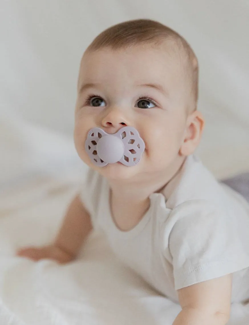 Дизайн пустышки Infinity вдохновлен красивой и непредсказуемой скандинавской природой. Переплетающиеся круги накладки символизируют бесконечность. Симметричный плоский сосок каплевидной формы способствует правильному положению языка во время сосания и развитию челюстно-лицевых мышц малыша.
