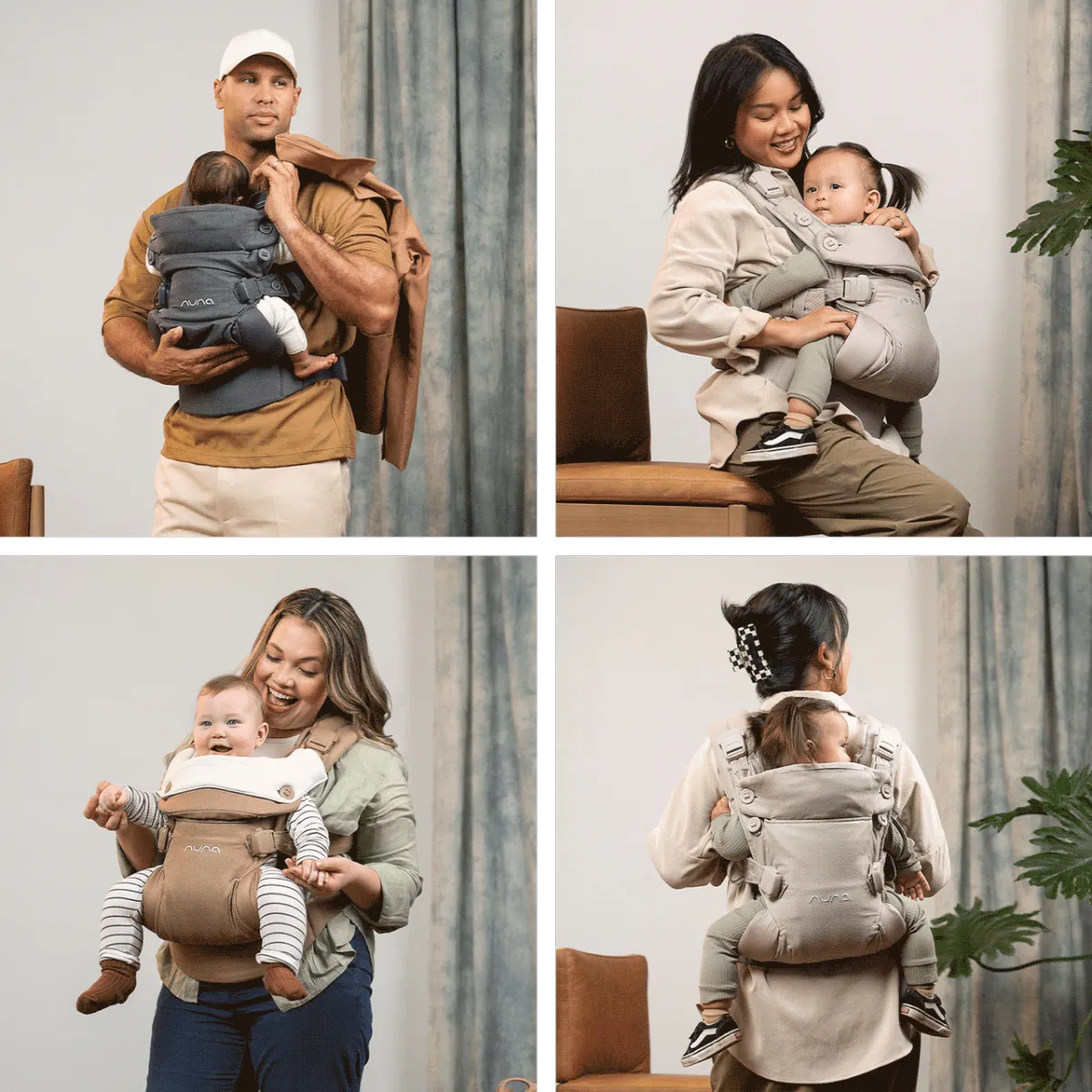 - 4 положения для переноски обеспечивают адаптивное позиционирование по мере роста ребенка: режим новорожденного, лицом к себе, лицом от себя, ношение на спине