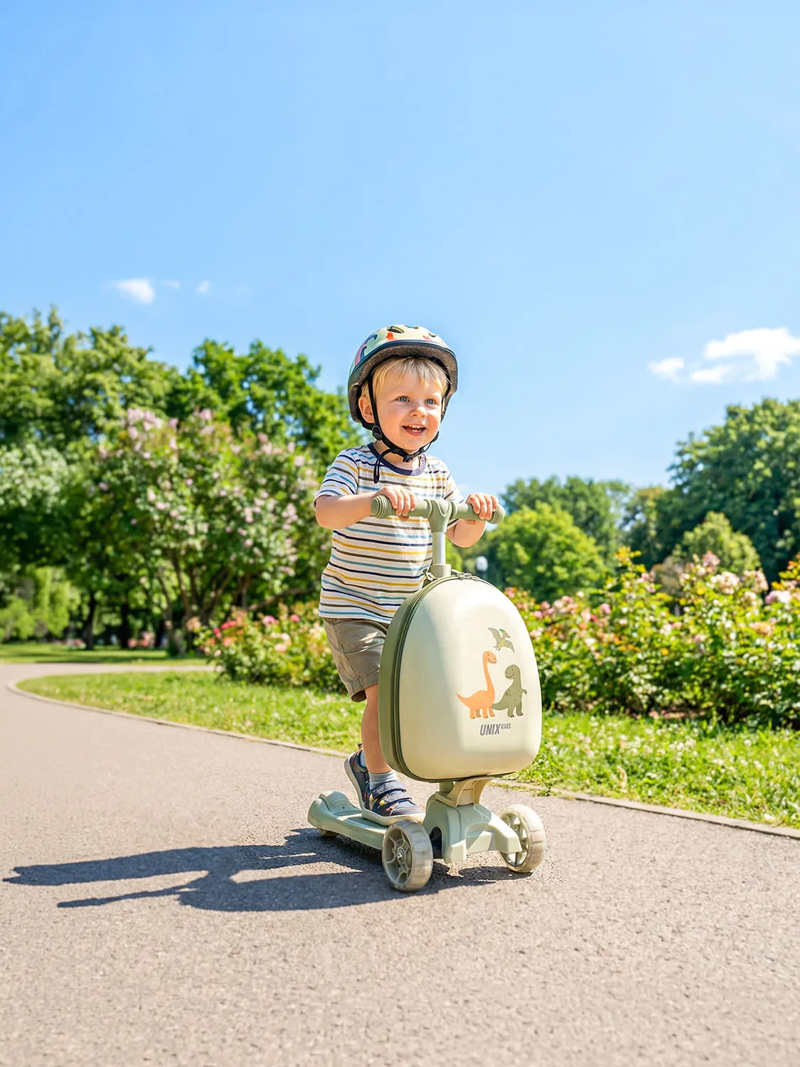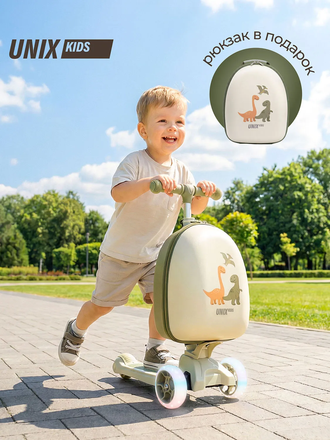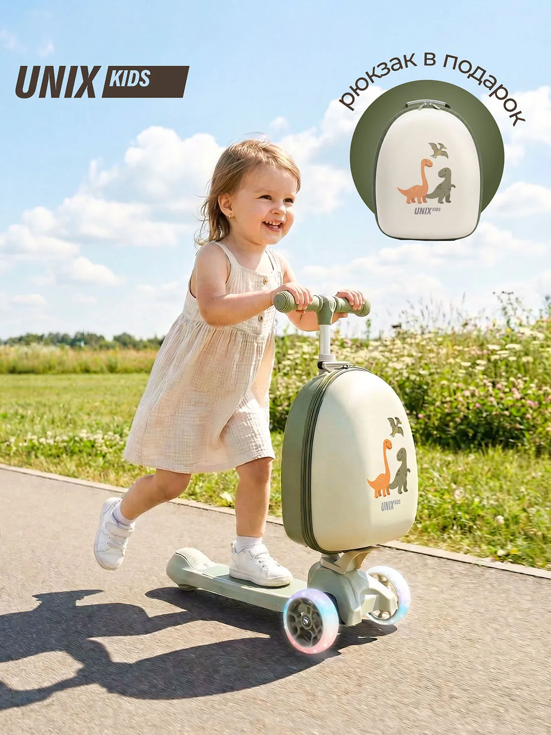 Детский трехколесный самокат UNIX Kids с чемоданом-рюкзаком в комплекте разработан специально для юных райдеров (девочек и мальчиков), любящих активно проводить свободное время на улице и получать удовольствие от катания.