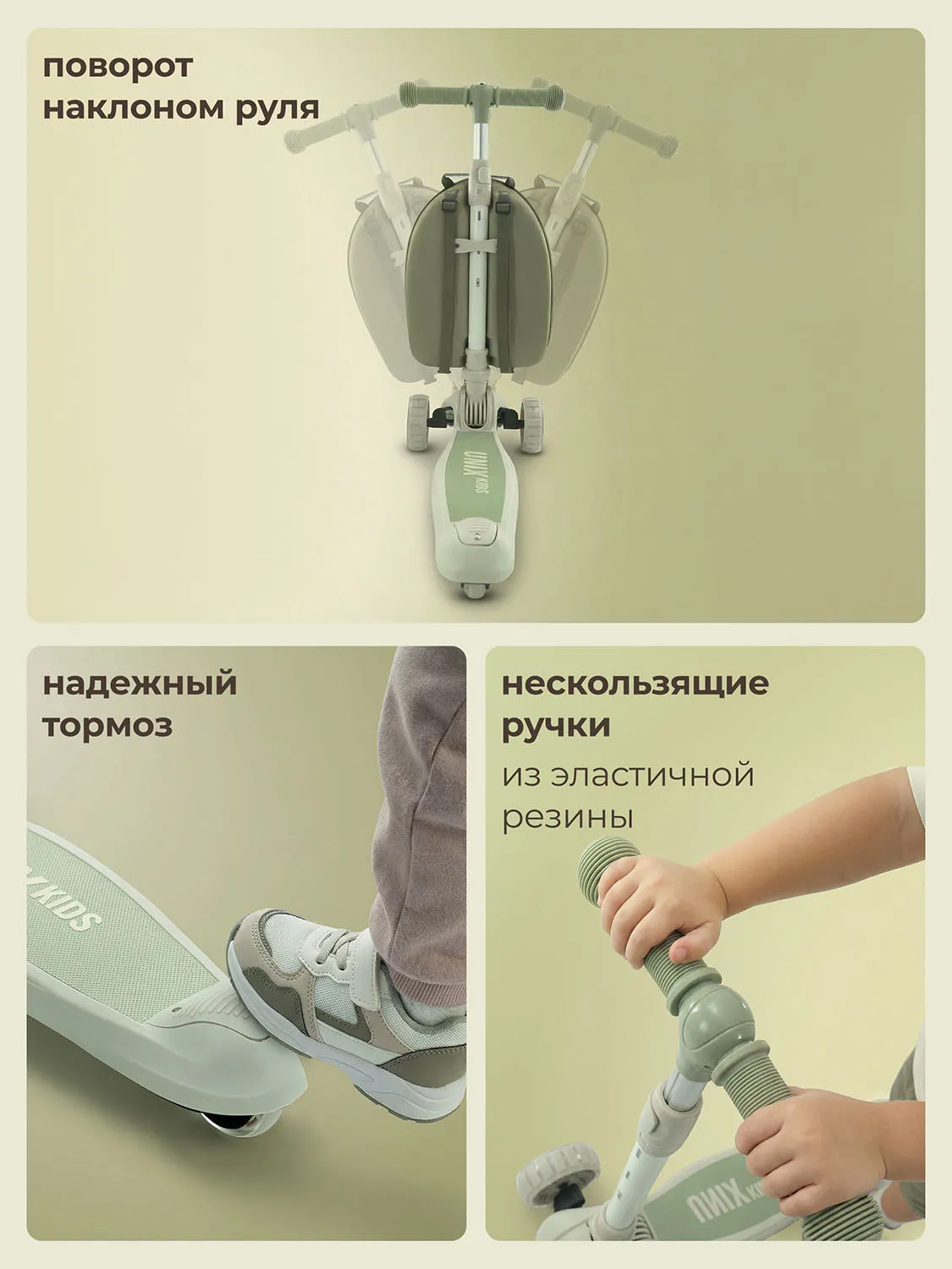 Тихие полиуретановые колеса диаметром 12 см спереди и 8 см сзади оснащены подсветкой, активирующейся при наборе скорости. Ее непременно оценит маленький владелец транспорта. Подсветка добавляет элемент развлечения и повышает заметность ребенка на прогулке вечером. Надежный механизм тормоза на заднем колесе позволяет мягко и быстро остановить движение при необходимости.