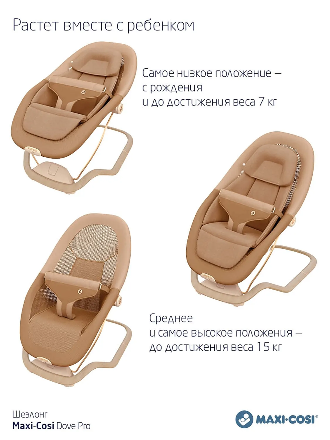 Шезлонг Dove Pro — растет вместе с ребенком. Его можно использовать для детей с рождения и до 9 кг как шезлонг, а до трех лет — будет служить удобным креслом для ребенка, пока вес ребенка не достигнет 15 кг