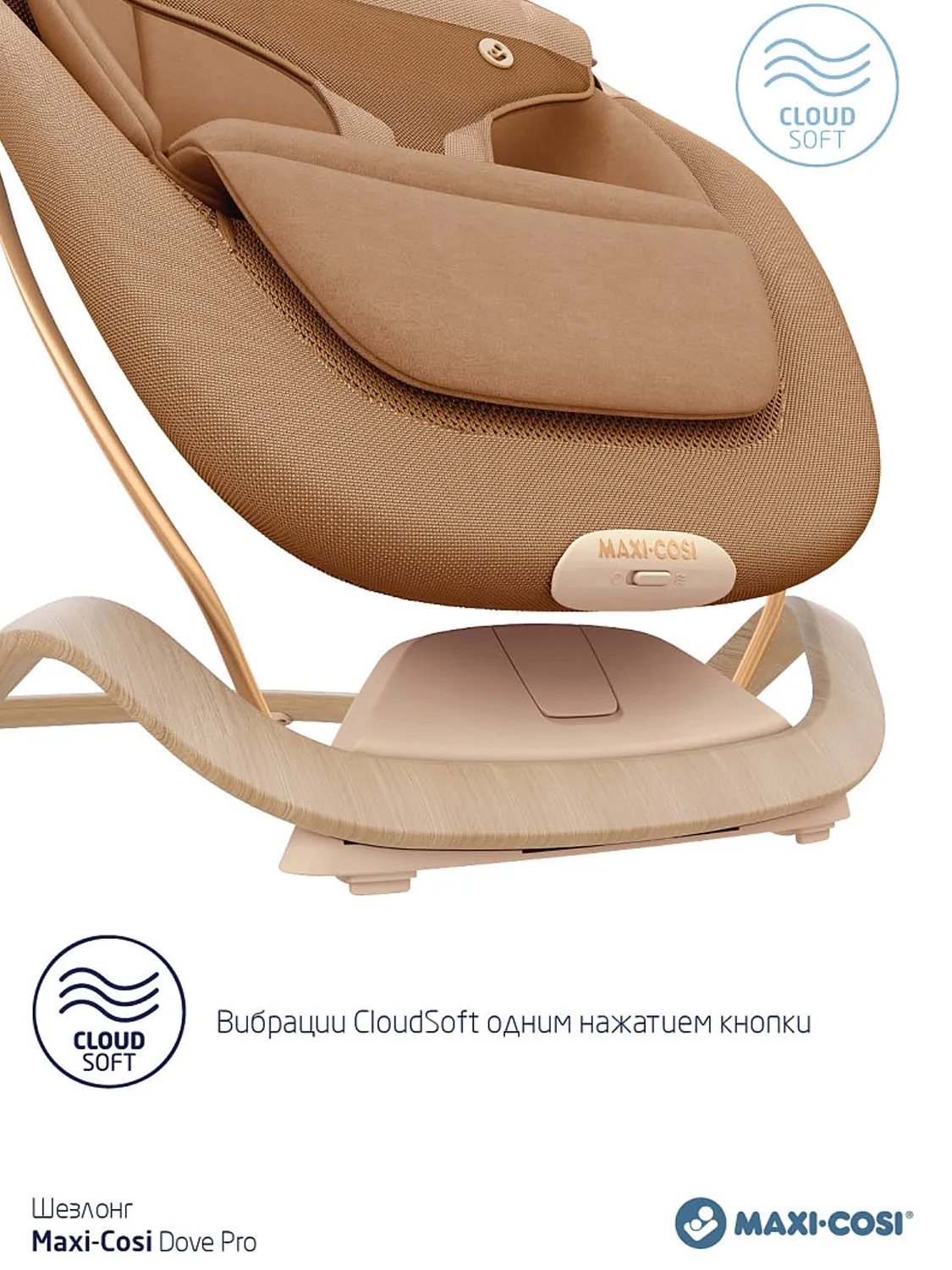 Dove Pro — это повышенного комфорта детский шезлонг с рождения, который сочетает в себе лучшее из всех мировых разработок для детских шезлонгов. Ваш малыш наслаждается естественными качанием, стимулируемыми его собственной игрой, когда он машет ручками и ножками. А когда приходит время дать этим маленьким ручкам и ножкам отдохнуть, мягкие вибрации CloudSoft помогают им расслабиться.