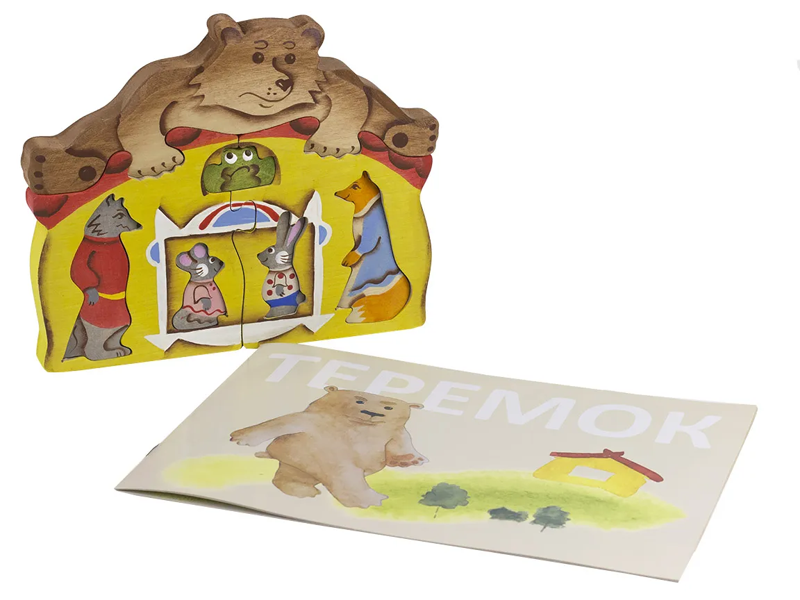 К игрушке прилагается книжка-сказка «Теремок» с иллюстрациями, выполненными по композиции. Поэтому сказка на бумаге и сказка из дерева образуют уникальный подарочный набор. Игрушка сертифицирована для детей с 3 лет.