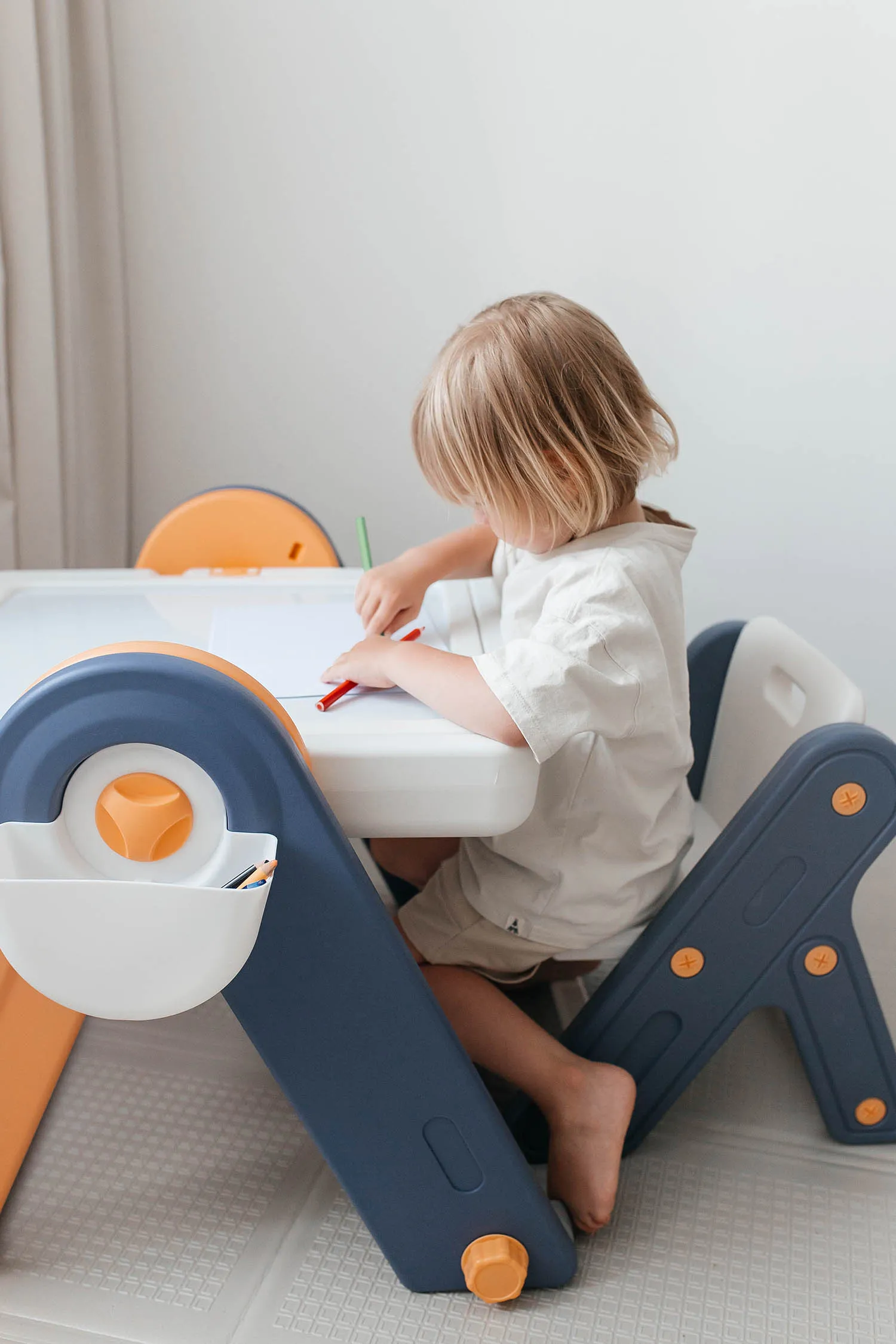 Все детали детского стола и стула выполнены из качественного и безопасного пластика. Благодаря своей складной конструкции его удобно хранить в любом месте. Это не просто мебель для детской комнаты, это настоящий игровой центр! Все элементы легко собираются и разбираются.