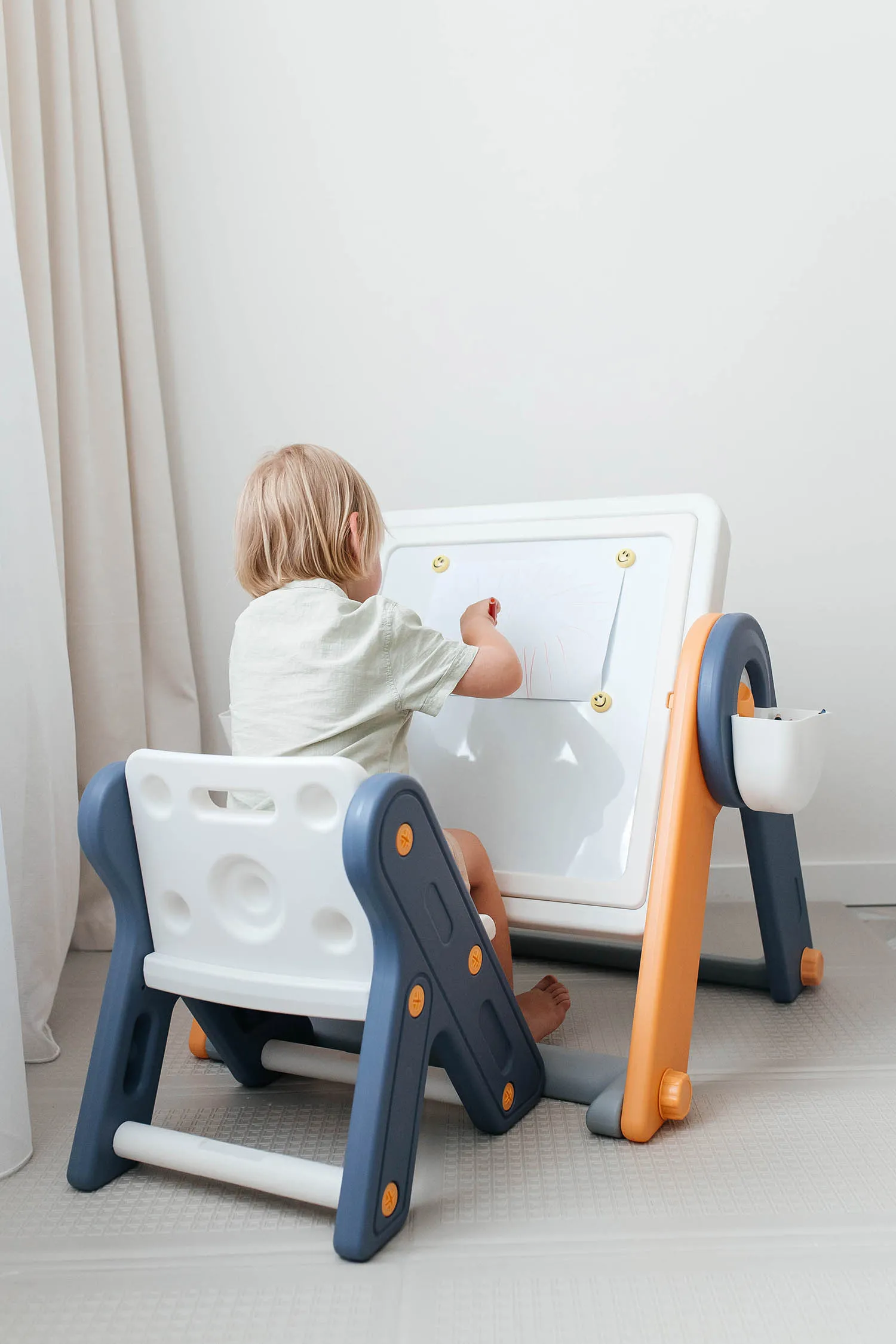 Использование мольберта способствует развитию у малышей мелкой моторики, аккуратности, усидчивости, внимания, воображения, мышления и восприятия цвета. Доска для рисования легко очищается губкой. Благодаря своей уникальной конструкции, столик превращается в настоящий универсальный помощник в играх и творчестве.