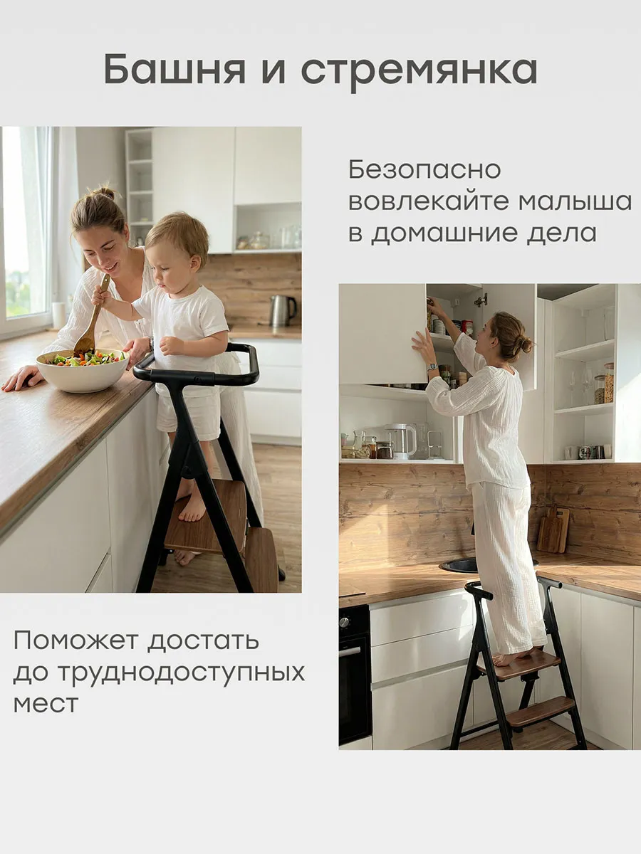 - Стульчик-трансформер – превращается в шезлонг или башню-помощника, подстраиваясь под возраст и потребности ребенка;