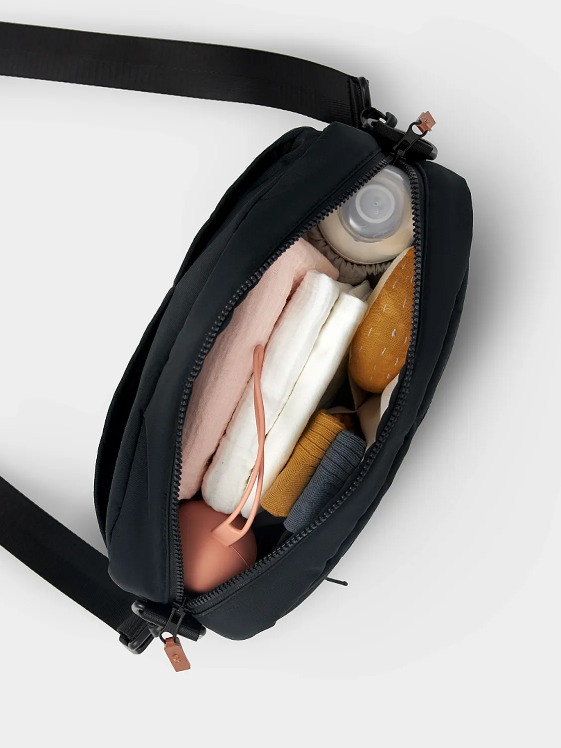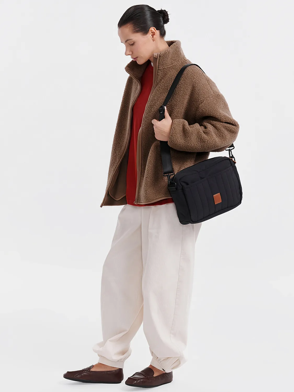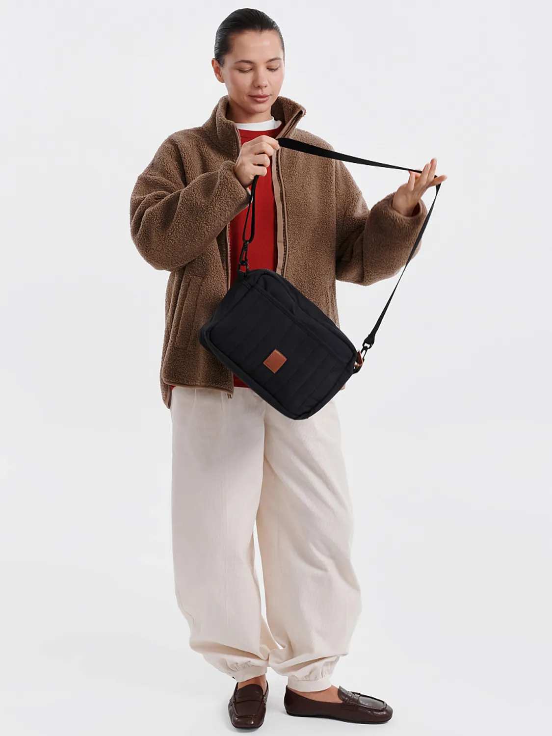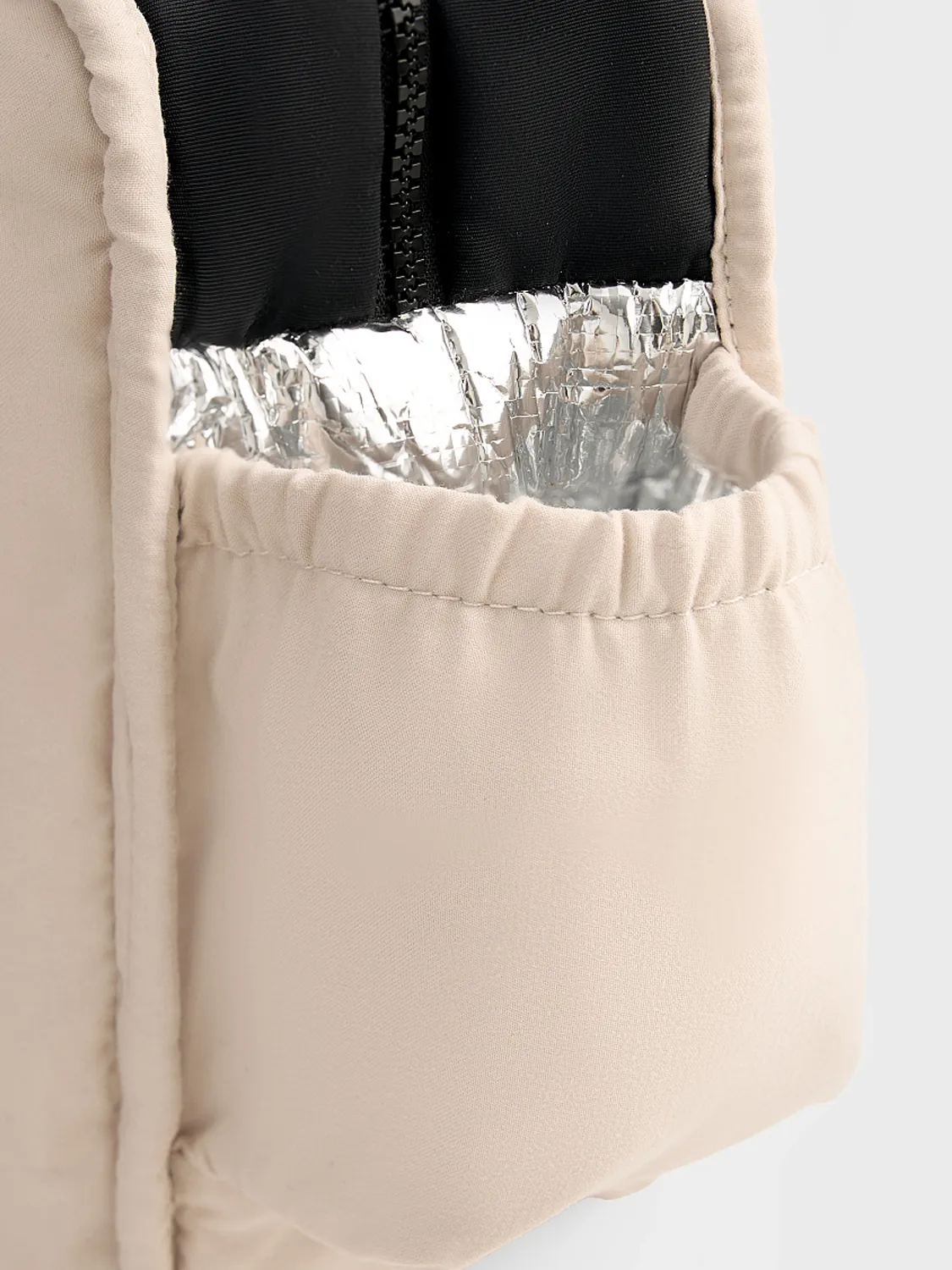 Снаружи — непромокаемая ткань, внутри — мягкая и износостойкая подкладка с пятью продуманными отделениями. Один из них — термокарман — сохраняет температуру бутылочки как в жару, так и в холод.