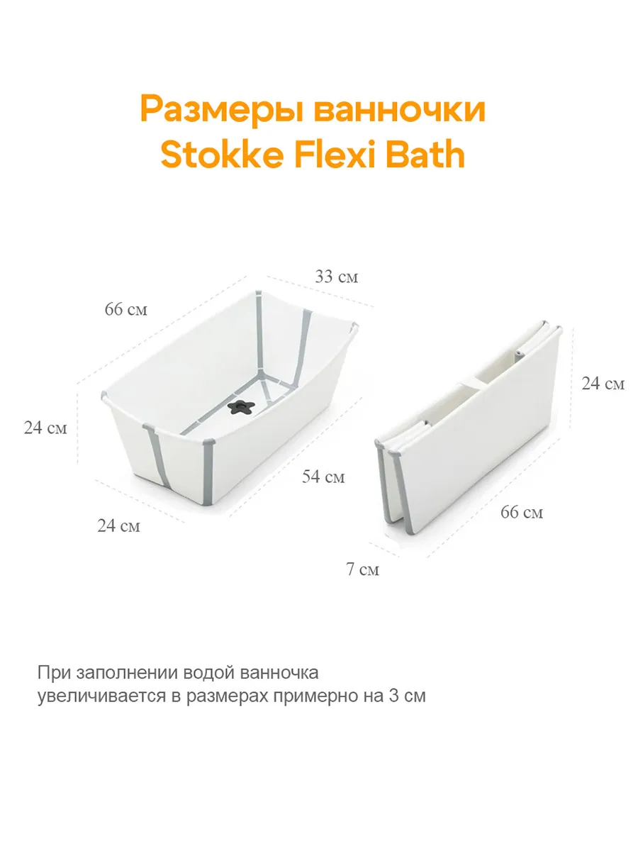 - Подставка для ванны Stokke Flexi Bath Stand также может быть добавлена в качестве аксессуара и предназначена для сближения вас и вашего малыша, для укрепления связи и игр во время купания. Она складывается вместе с ванной и занимает мало места. Подставка приобретается отдельно;