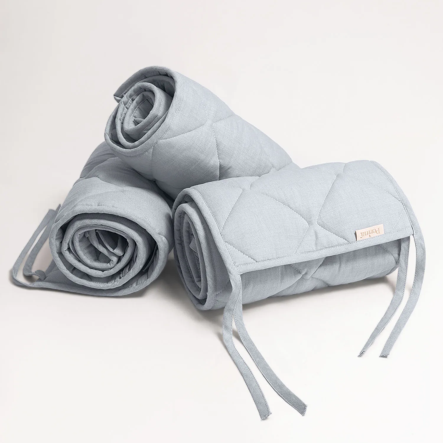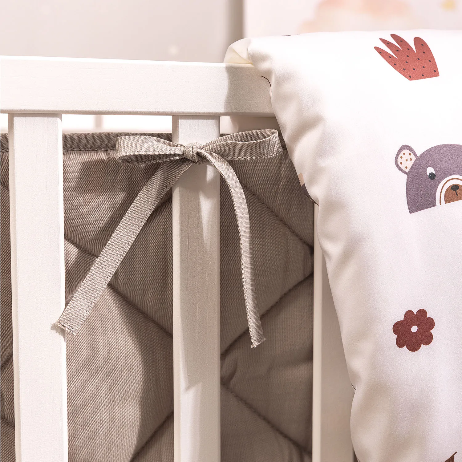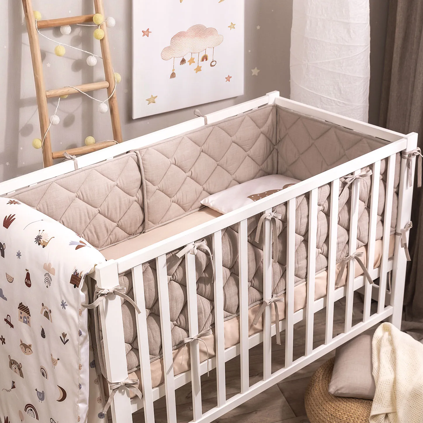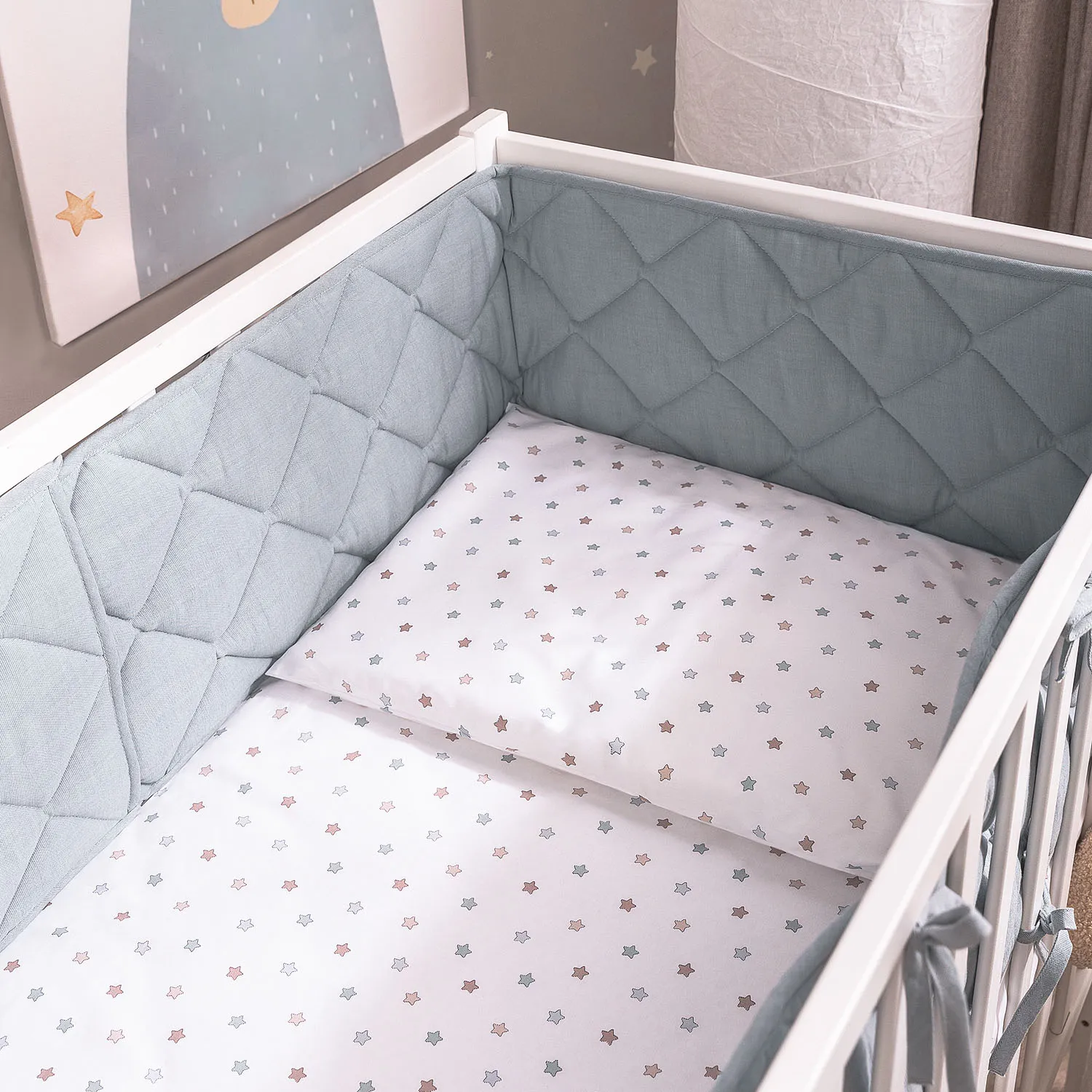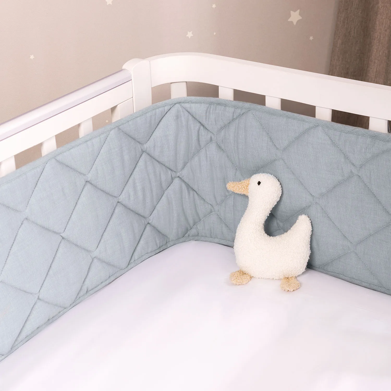 Стеганая структура делает бортики плотными и упругими, но при этом гибкими, чтобы легко принять нужную форму по периметру кроватки. Они хорошо защищают малыша от сквозняков, застреваний, случайных ударов и создают уютную атмосферу для спокойного сна.