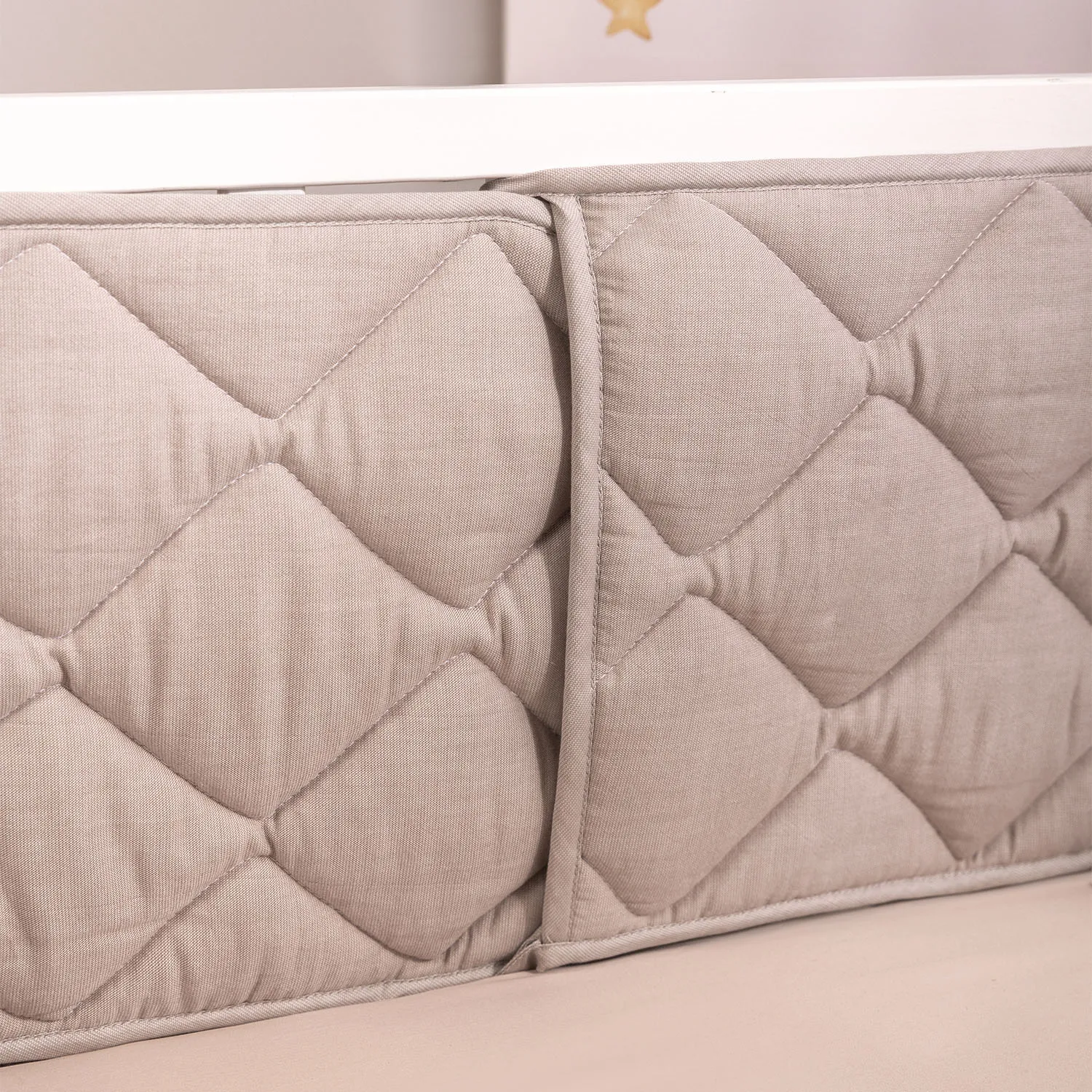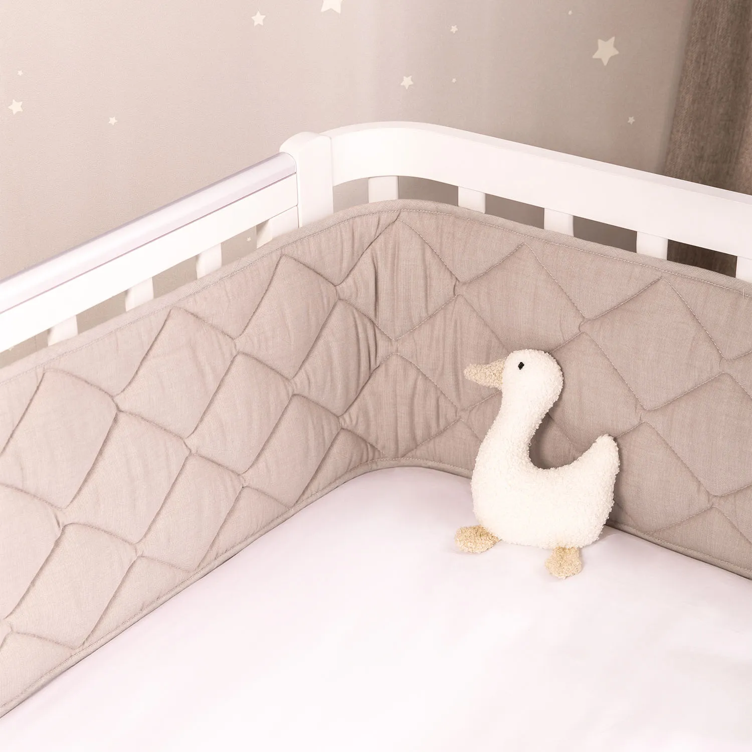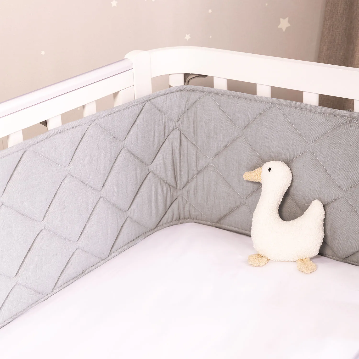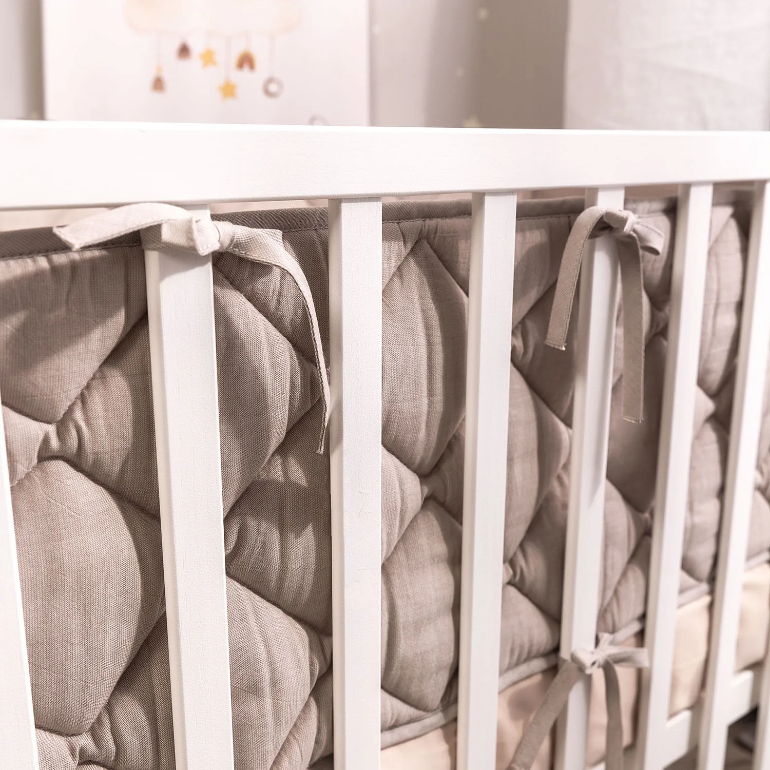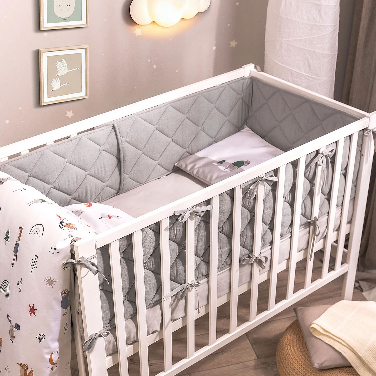 Стеганая структура делает бортики плотными и упругими, но при этом гибкими, чтобы легко принять нужную форму по периметру кроватки. Они хорошо защищают малыша от сквозняков, застреваний, случайных ударов и создают уютную атмосферу для спокойного сна.