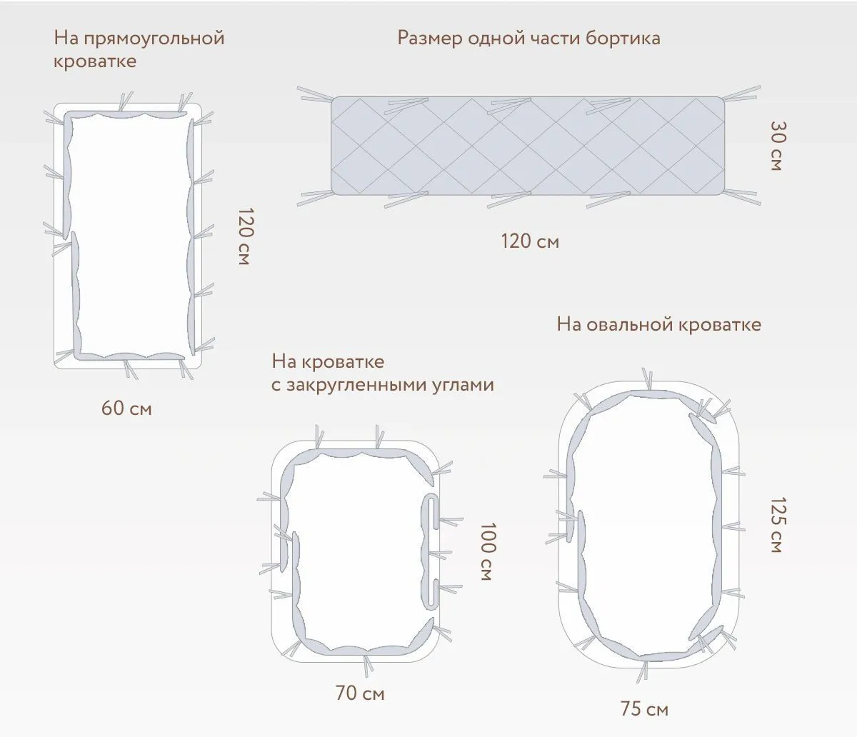 - Подходят для следующих размеров кроваток: 120х60 см, 125х75 см (овальная кроватка), 100х70 см